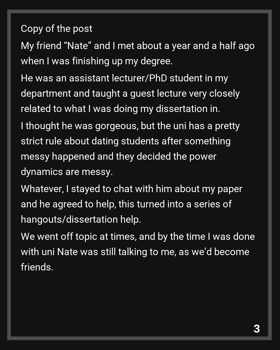 My friend “Nate” and I met about a year and a half ago when I was finishing up my degree. He was an assistant lecturer/PhD student in my department and taught a guest lecture very closely related to what I was doing my dissertation in. I thought he was gorgeous, but the uni has a pretty strict rule about dating students after something messy happened and they decided the power dynamics are messy.