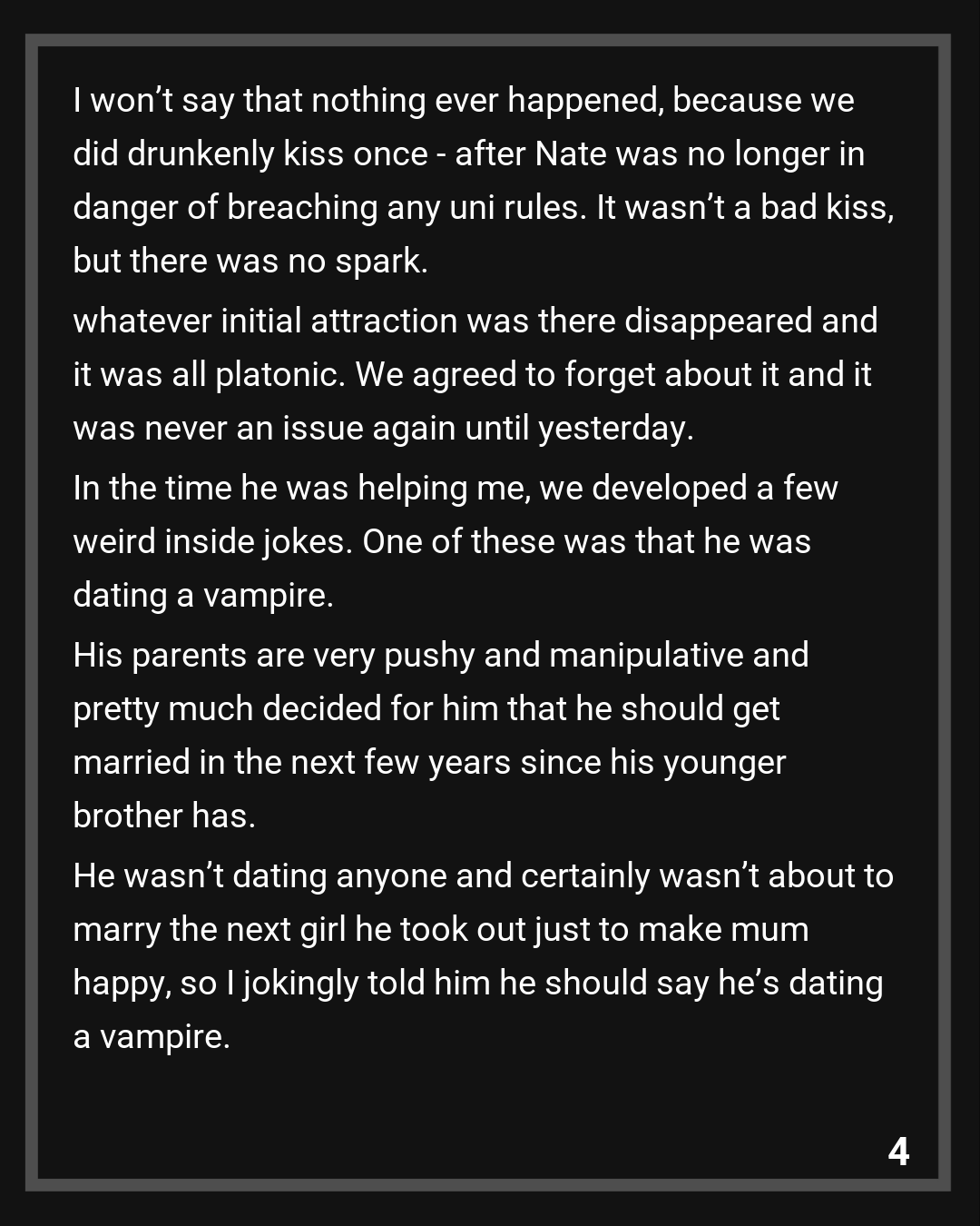 I won’t say that nothing ever happened, because we did drunkenly kiss once – after Nate was no longer in danger of breaching any uni rules. It wasn’t a bad kiss, but there was no spark. whatever initial attraction was there disappeared and it was all platonic. We agreed to forget about it and it was never an issue again until yesterday.