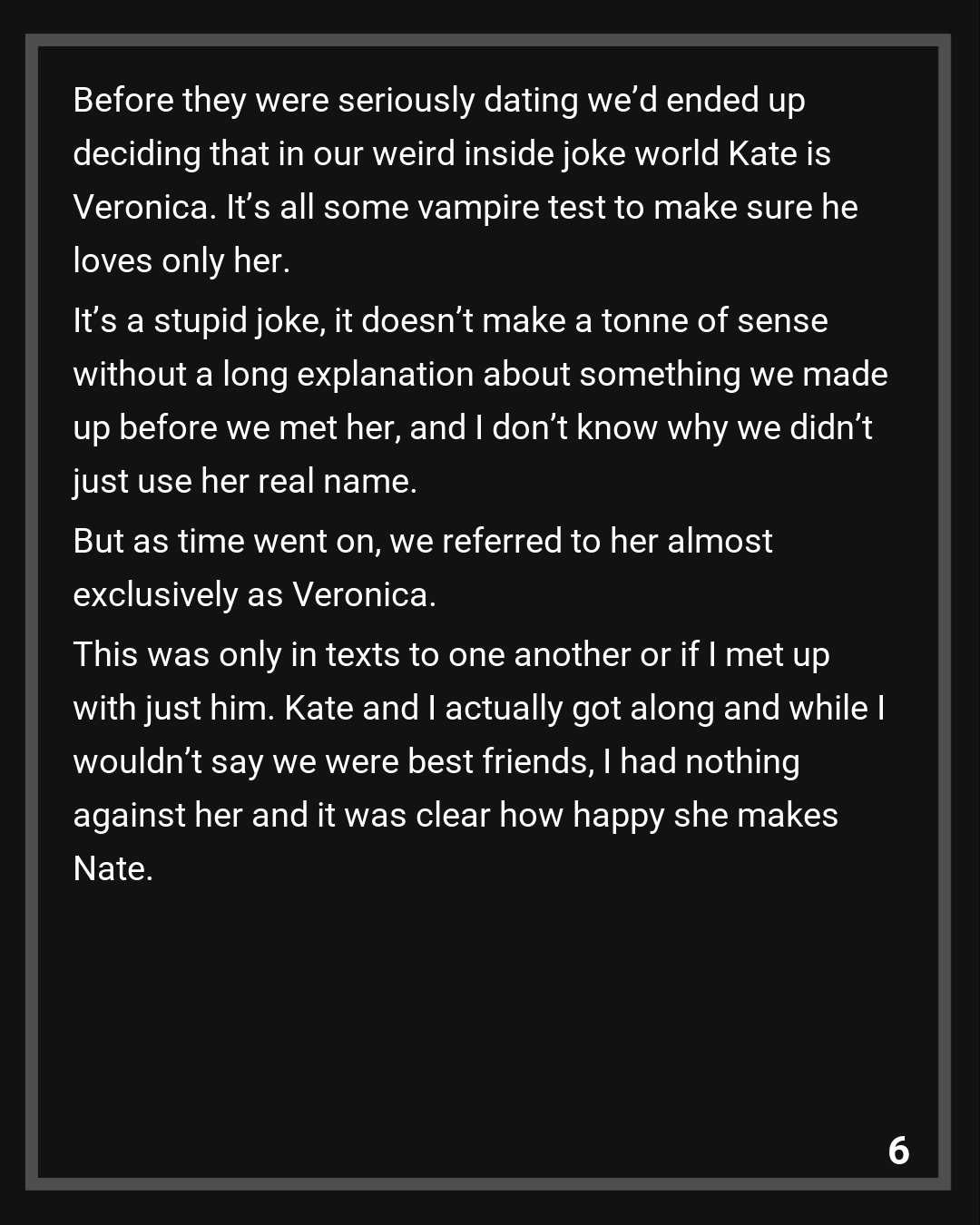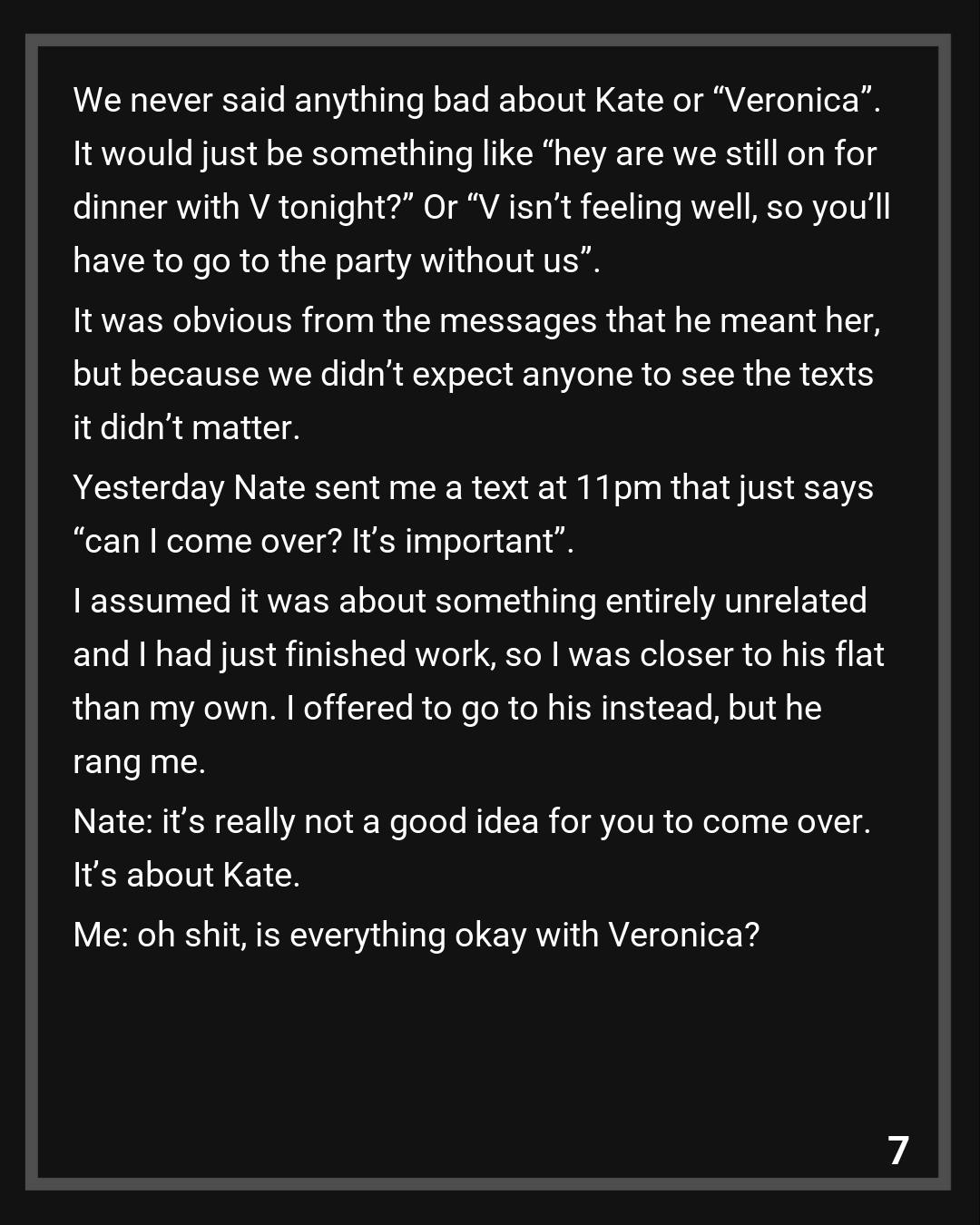 This was only in texts to one another or if I met up with just him. Kate and I actually got along and while I wouldn’t say we were best friends, I had nothing against her and it was clear how happy she makes Nate. We never said anything bad about Kate or “Veronica”. It would just be something like “hey are we still on for dinner with V tonight?” Or “V isn’t feeling well, so you’ll have to go to the party without us”. It was obvious from the messages that he meant her, but because we didn’t expect anyone to see the texts it didn’t matter.