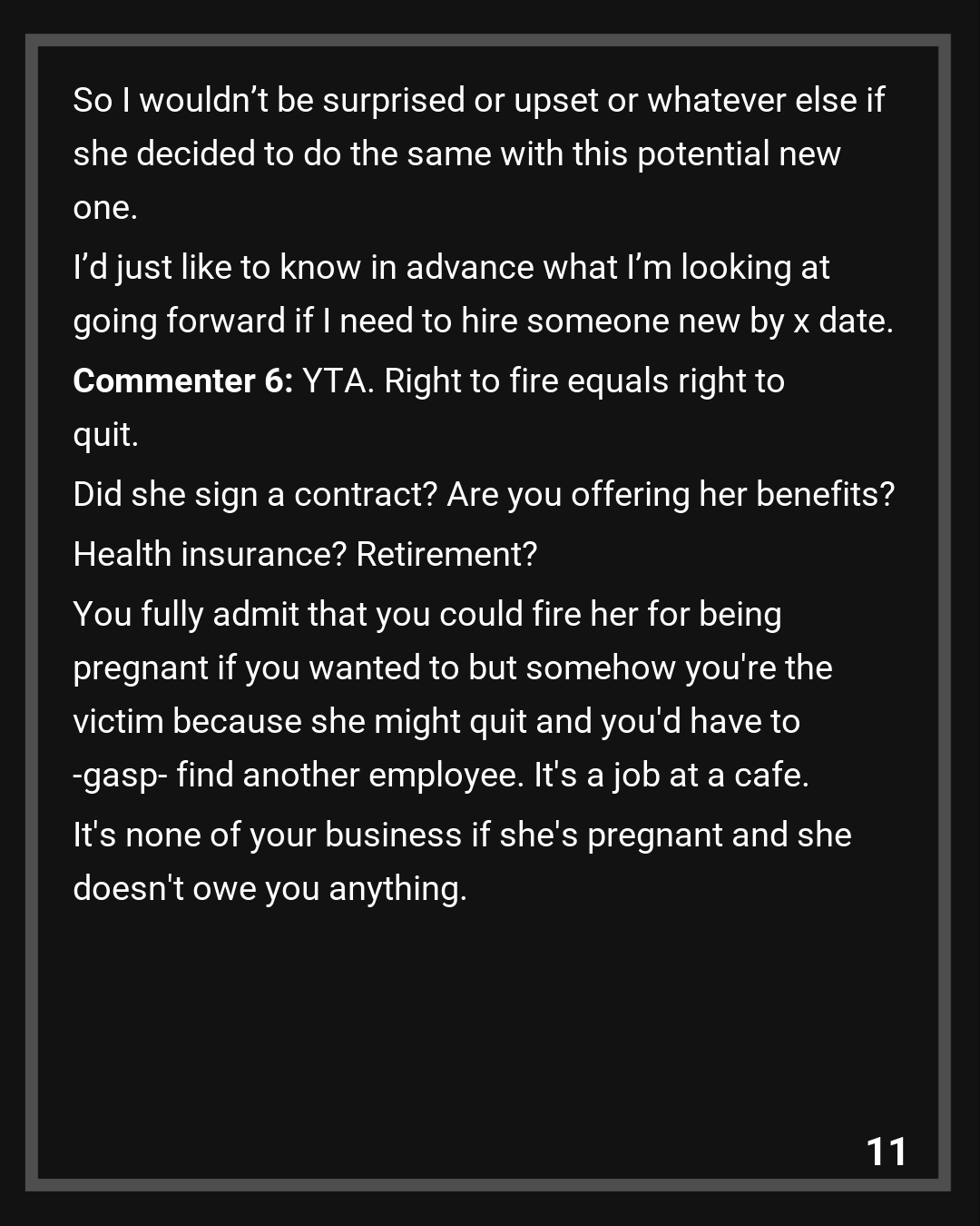 Commenter 6: YTA. Right to fire equals right to quit. Did she sign a contract? Are you offering her benefits? Health insurance? Retirement? You fully admit that you could fire her for being pregnant if you wanted to but somehow you’re the victim because she might quit and you’d have to -gasp- find another employee. It’s a job at a cafe. It’s none of your business if she’s pregnant and she doesn’t owe you anything.