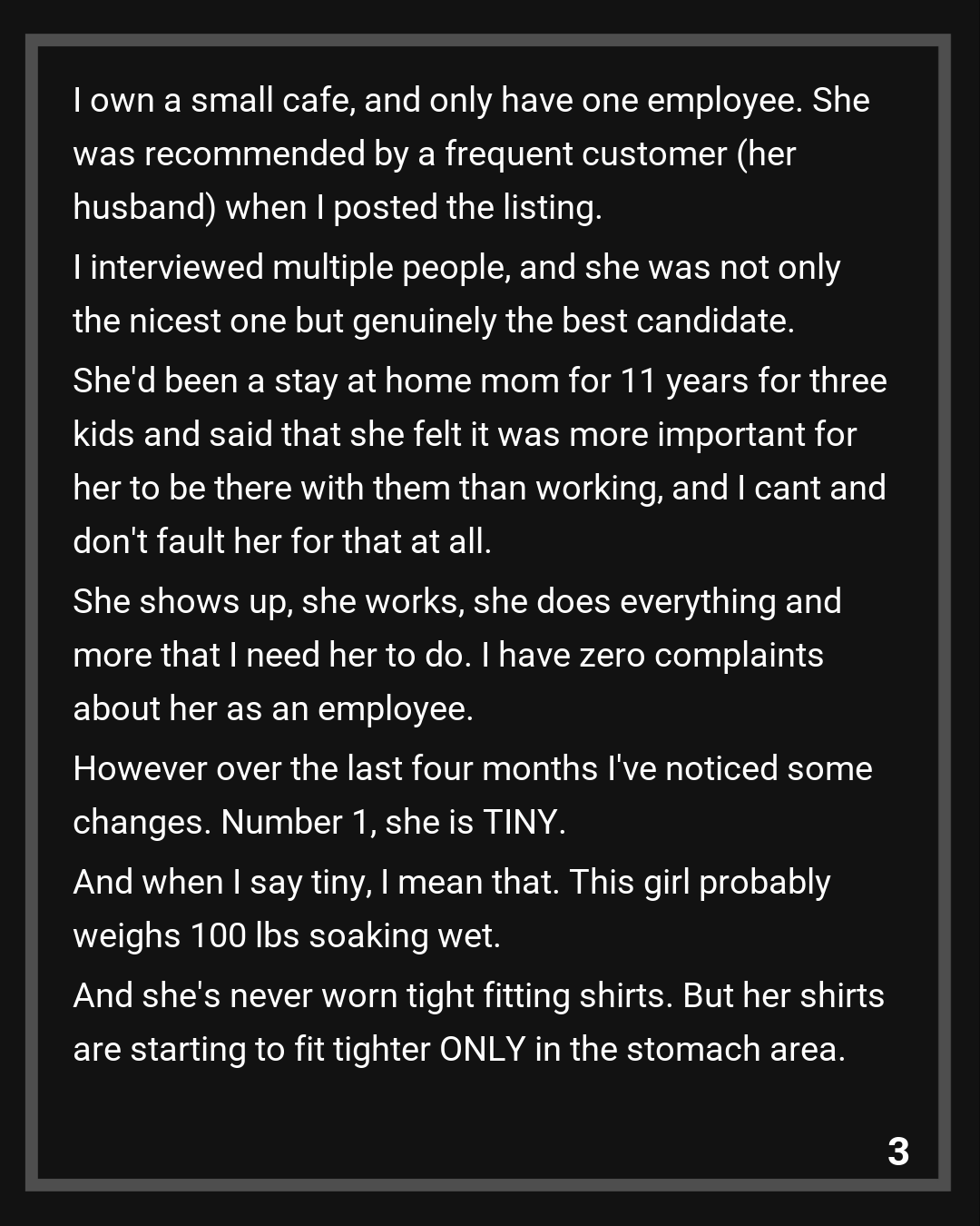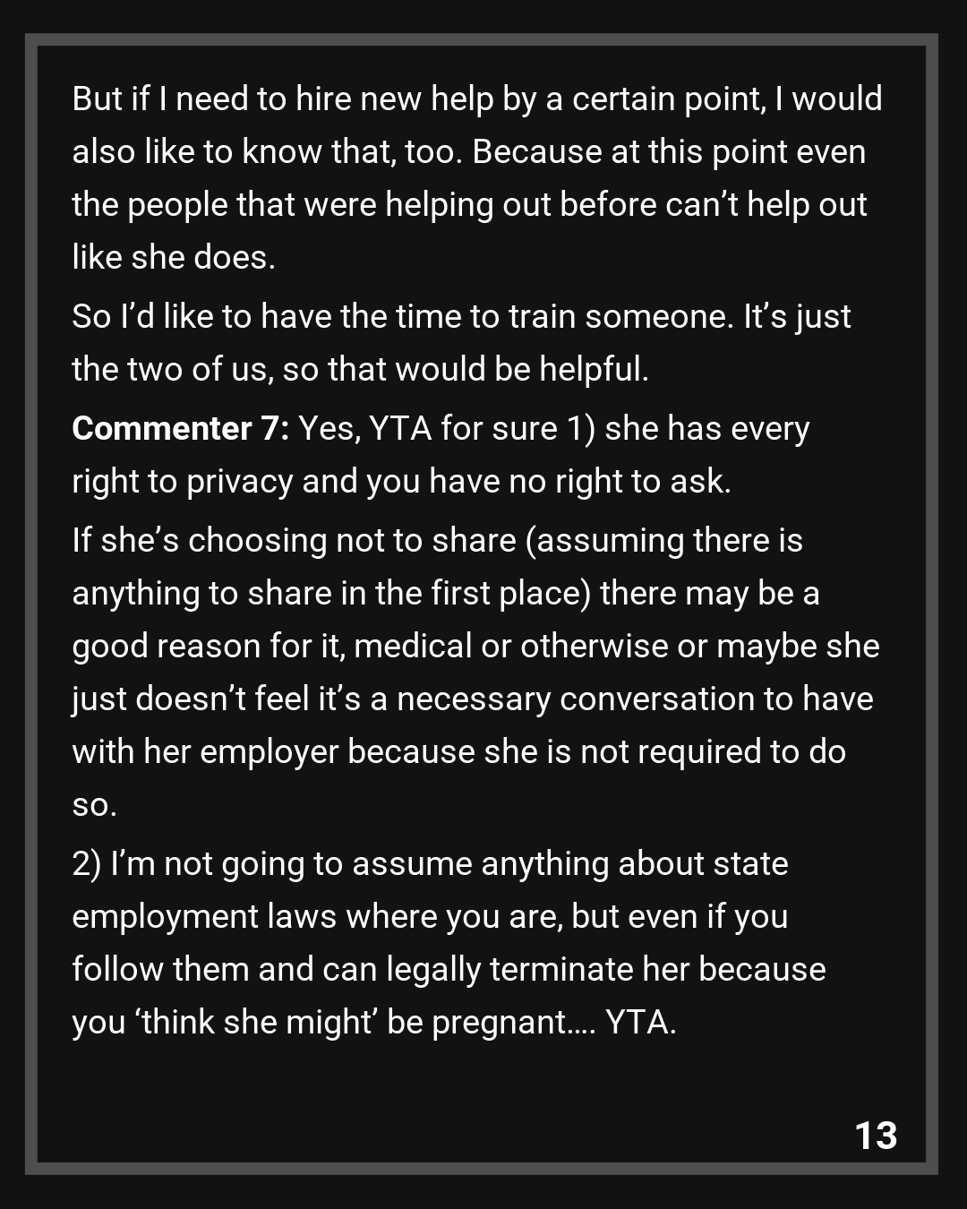 Commenter 7: Yes, YTA for sure 1) she has every right to privacy and you have no right to ask. If she’s choosing not to share (assuming there is anything to share in the first place) there may be a good reason for it, medical or otherwise or maybe she just doesn’t feel it’s a necessary conversation to have with her employer because she is not required to do so. 2) I’m not going to assume anything about state employment laws where you are, but even if you follow them and can legally terminate her because you ‘think she might’ be pregnant…. YTA. Also you run a cafe, not a surgical team. Hire someone part time so you feel more comfortable. Sheesh