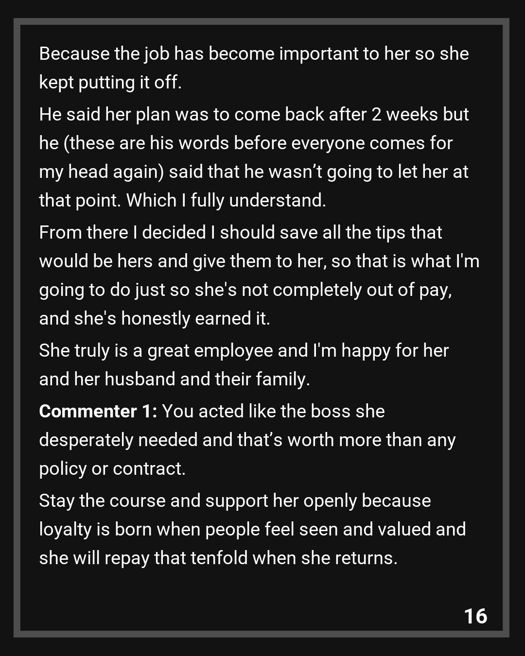 Commenter 1: You acted like the boss she desperately needed and that’s worth more than any policy or contract. Stay the course and support her openly because loyalty is born when people feel seen and valued and she will repay that tenfold when she returns.