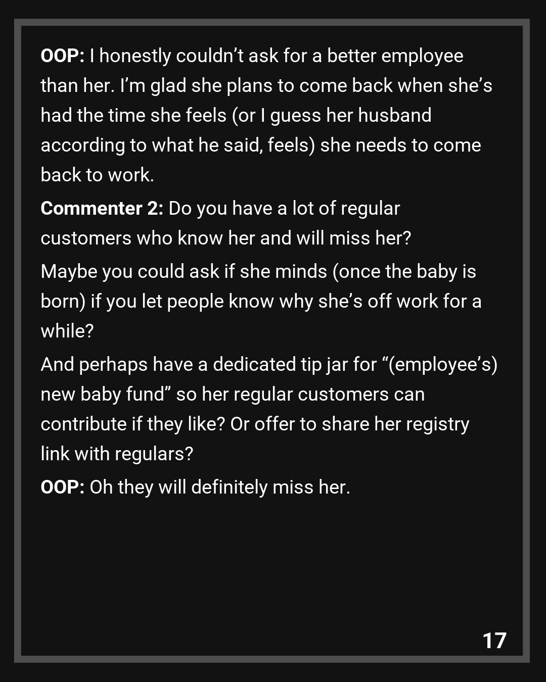 OOP: I honestly couldn’t ask for a better employee than her. I’m glad she plans to come back when she’s had the time she feels (or I guess her husband according to what he said, feels) she needs to come back to work.