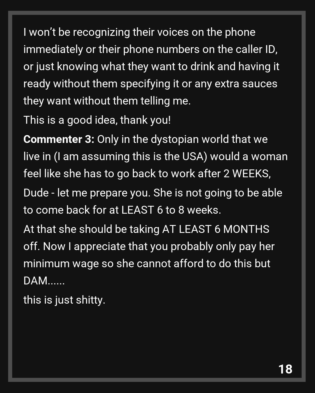 Commenter 4: I hope she or someone she knows has Reddit as well because you gave all the proof needed that it was because you “worried she wouldn’t return anyway” and guess what, you can delete the post but if people have links, they can return to them and it saves the ORIGINAL copy in the comments. You better pray you either wise up and wait or if you end up doing the morally wrong thing, that she nor anyone close to her doesn’t follow the aita subreddit, or if they do they can never figure out its about the cafe she works at. You better not fire her simply because you don’t know if she’ll return, because if you do, I’m hoping and praying someone she knows has reddit follows this subreddit and they get proof you fired because of her being pregnant. Here’s an idea, hire other people as well, but again DON’T fire her!