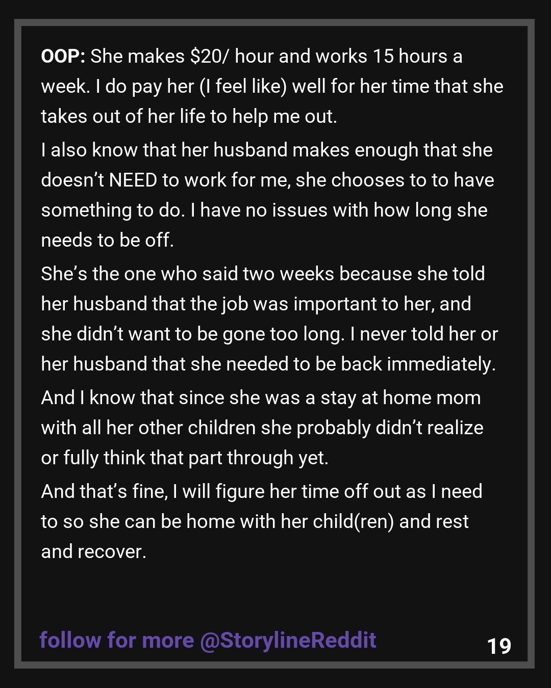 OOP: She makes $20/ hour and works 15 hours a week. I do pay her (I feel like) well for her time that she takes out of her life to help me out. I also know that her husband makes enough that she doesn’t NEED to work for me, she chooses to to have something to do. I have no issues with how long she needs to be off. She’s the one who said two weeks because she told her husband that the job was important to her, and she didn’t want to be gone too long. I never told her or her husband that she needed to be back immediately. And I know that since she was a stay at home mom with all her other children she probably didn’t realize or fully think that part through yet. And that’s fine, I will figure her time off out as I need to so she can be home with her child(ren) and rest and recover.