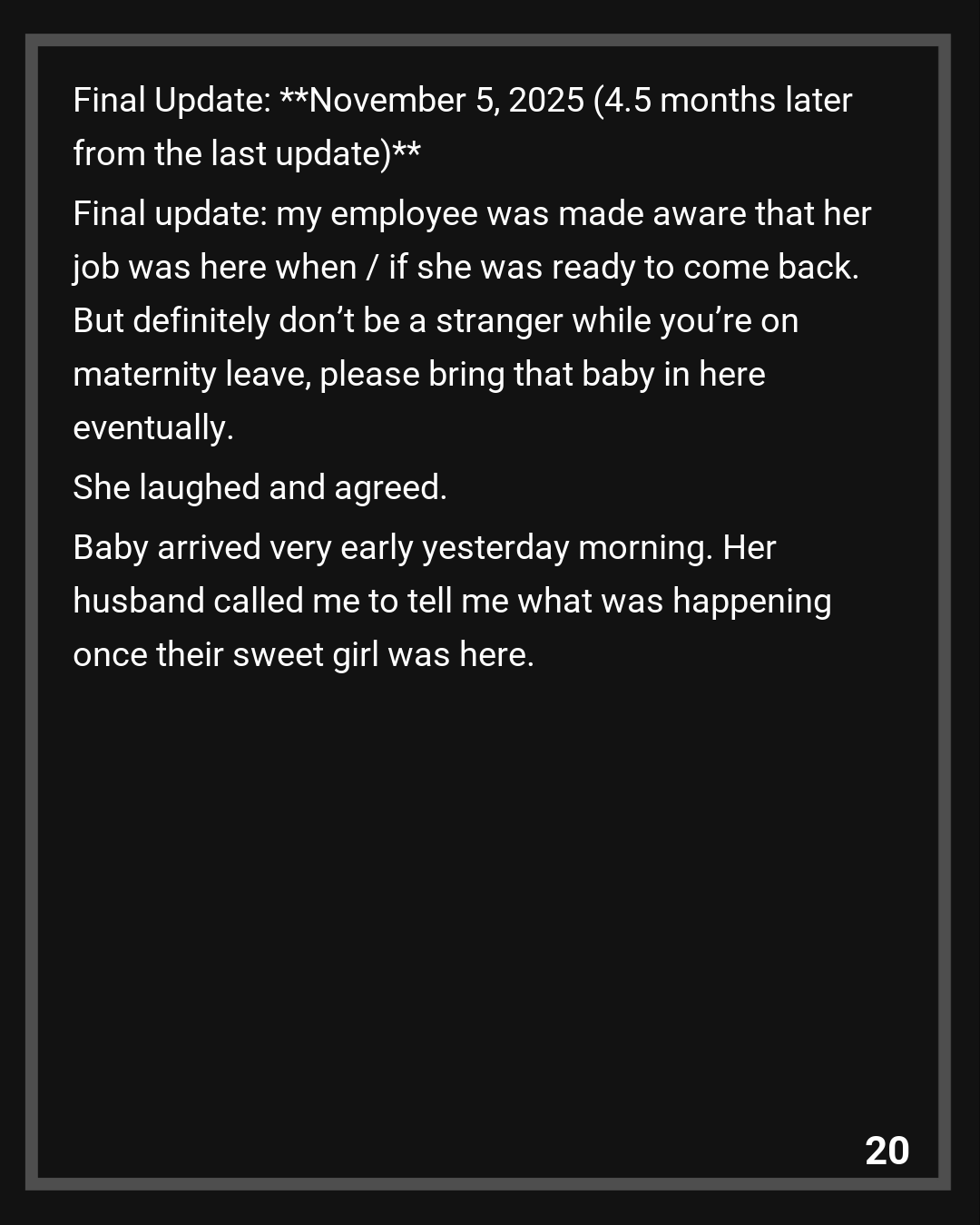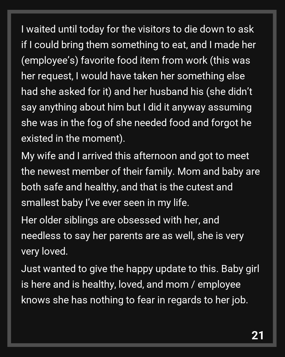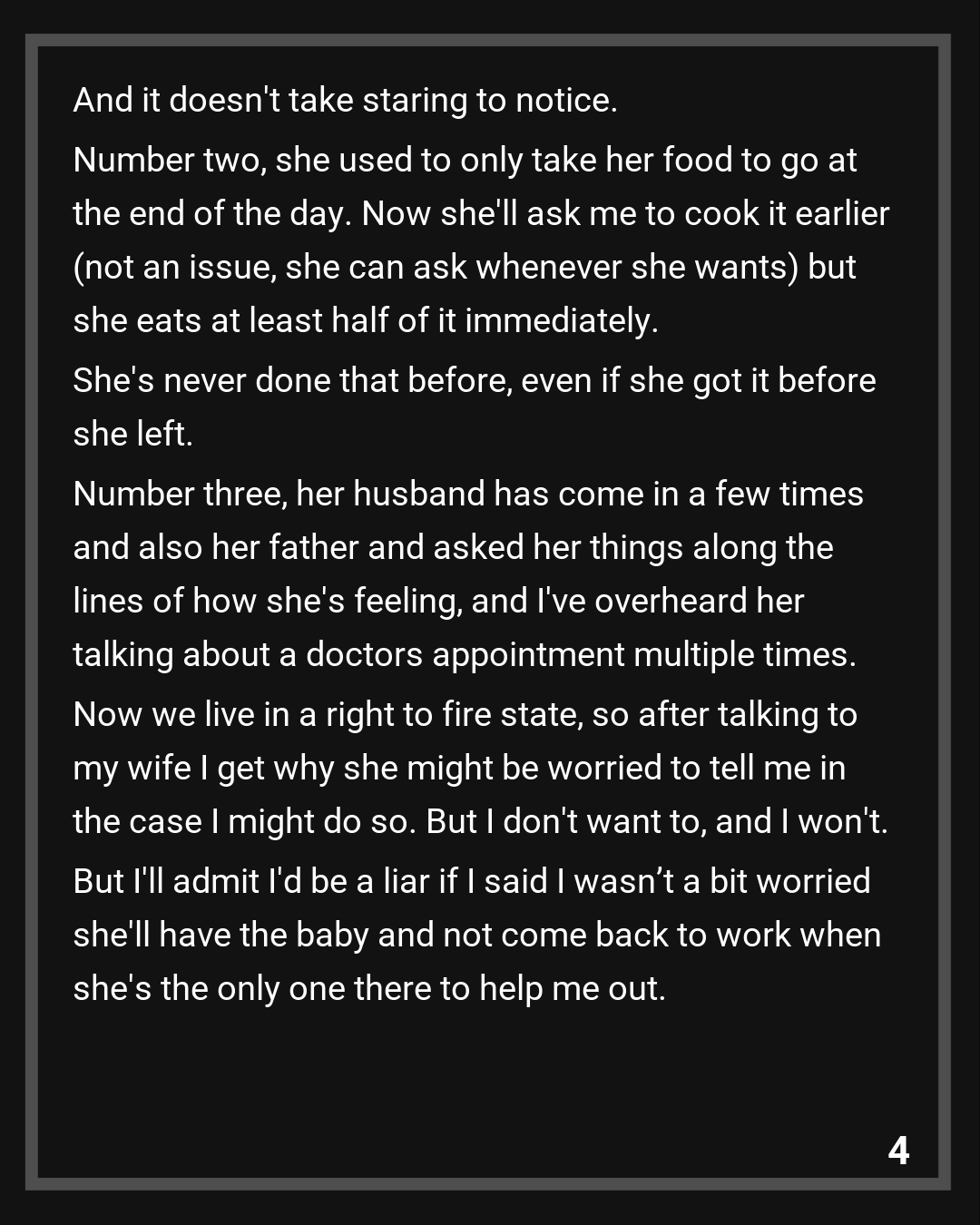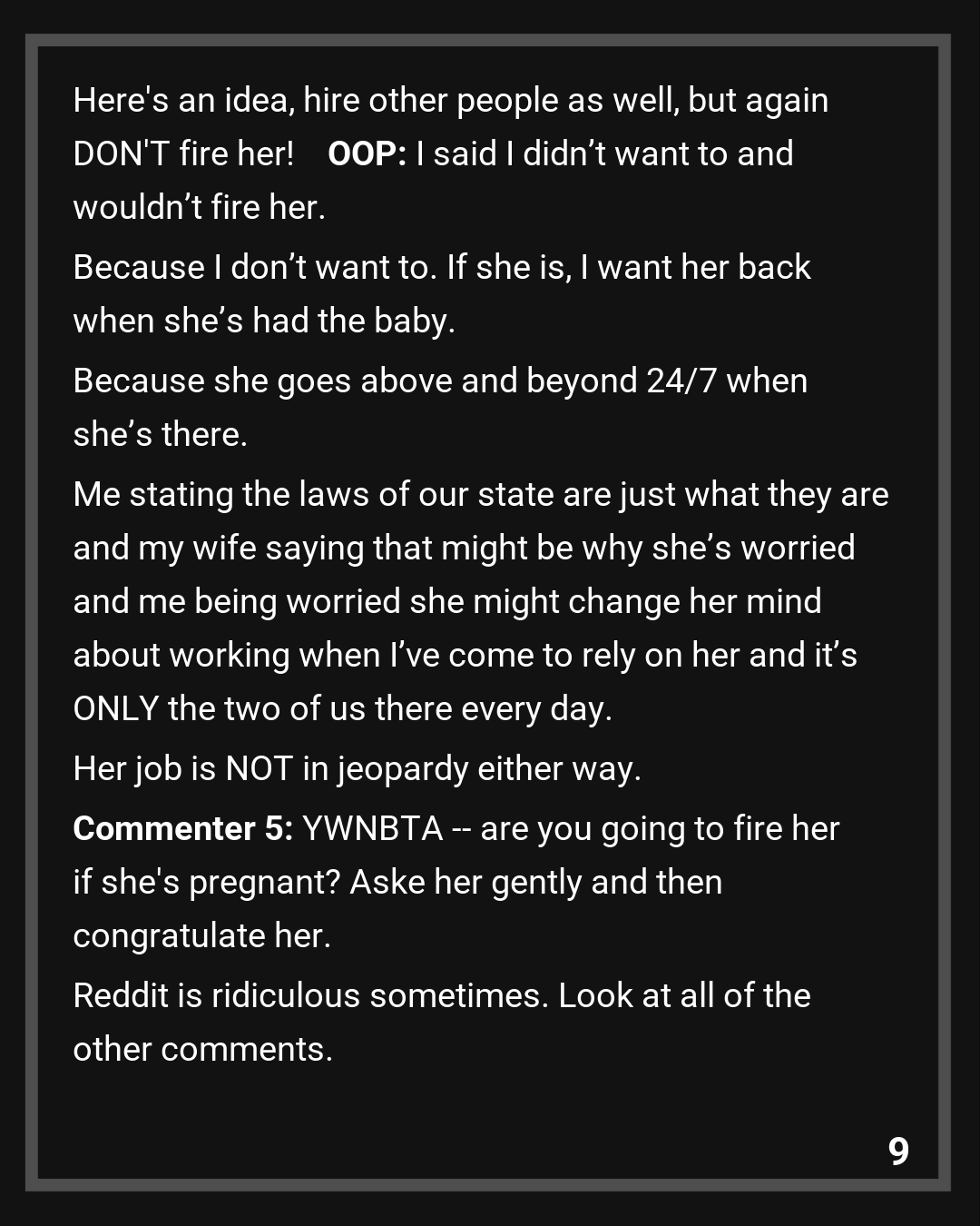 OOP: I said I didn’t want to and wouldn’t fire her. Because I don’t want to. If she is, I want her back when she’s had the baby. Because she goes above and beyond 24/7 when she’s there. Me stating the laws of our state are just what they are and my wife saying that might be why she’s worried and me being worried she might change her mind about working when I’ve come to rely on her and it’s ONLY the two of us there every day. Her job is NOT in jeopardy either way.