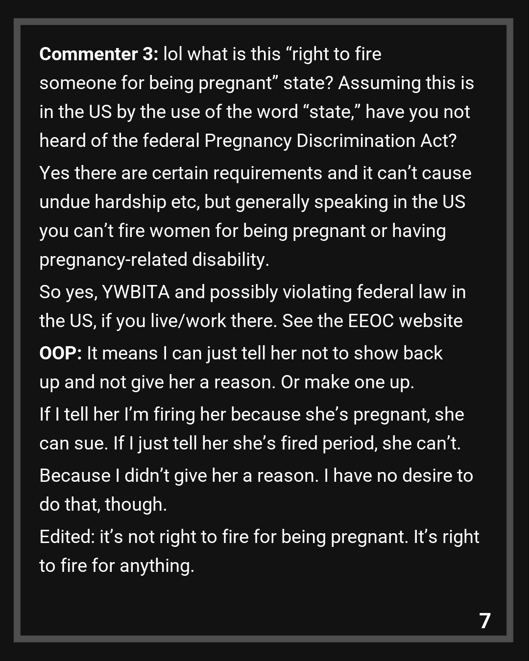 Commenter 3: lol what is this “right to fire someone for being pregnant” state? Assuming this is in the US by the use of the word “state,” have you not heard of the federal Pregnancy Discrimination Act? Yes there are certain requirements and it can’t cause undue hardship etc, but generally speaking in the US you can’t fire women for being pregnant or having pregnancy-related disability.