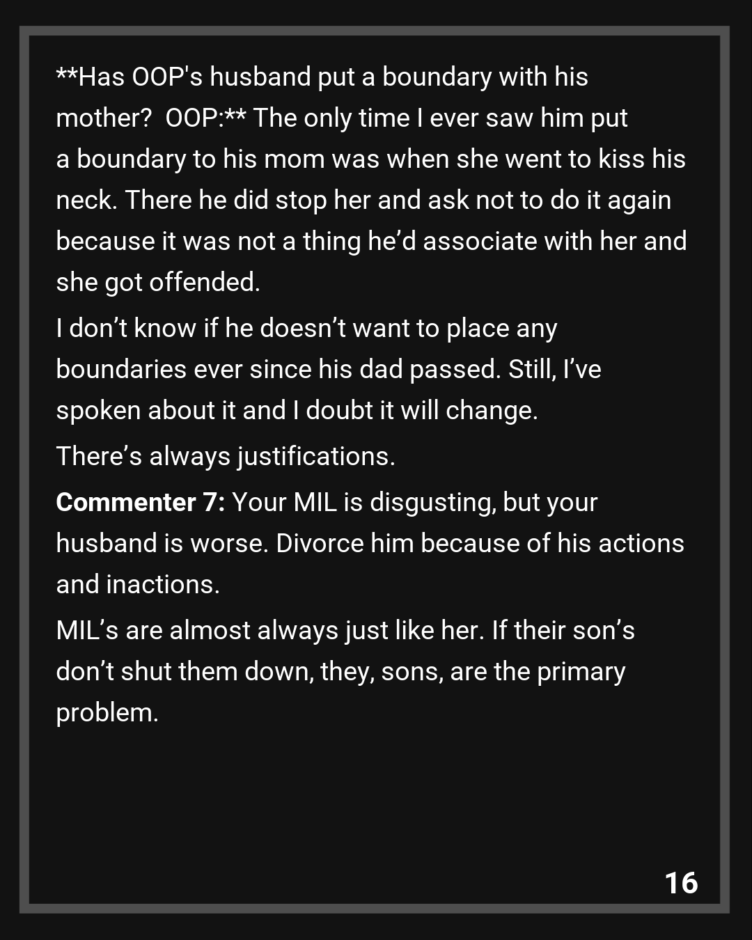 Commenter 7: Your MIL is disgusting, but your husband is worse. Divorce him because of his actions and inactions. MIL’s are almost always just like her. If their son’s don’t shut them down, they, sons, are the primary problem.