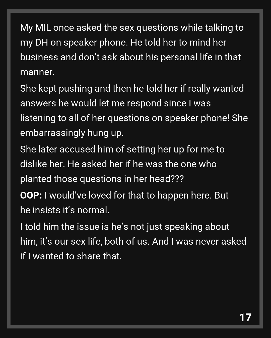 OOP: I would’ve loved for that to happen here. But he insists it’s normal. I told him the issue is he’s not just speaking about him, it’s our sex life, both of us. And I was never asked if I wanted to share that. He knows I’m very private and still didn’t care for it. He said it was just because she wanted to help because they were discussing if we would have babies. Again he knows that’s a sensitive issue because it’s very likely we have fertility issues. And we had agreed the only answer to people asking would be “We are open to it, but if it doesn’t happen we are also fine”. I think that’s enough explanation yet she went further to ask wether we used protection or not or what were we doing. I felt violated.