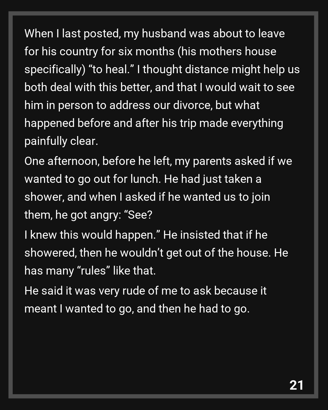 When I last posted, my husband was about to leave for his country for six months (his mothers house specifically) “to heal.” I thought distance might help us both deal with this better, and that I would wait to see him in person to address our divorce, but what happened before and after his trip made everything painfully clear.