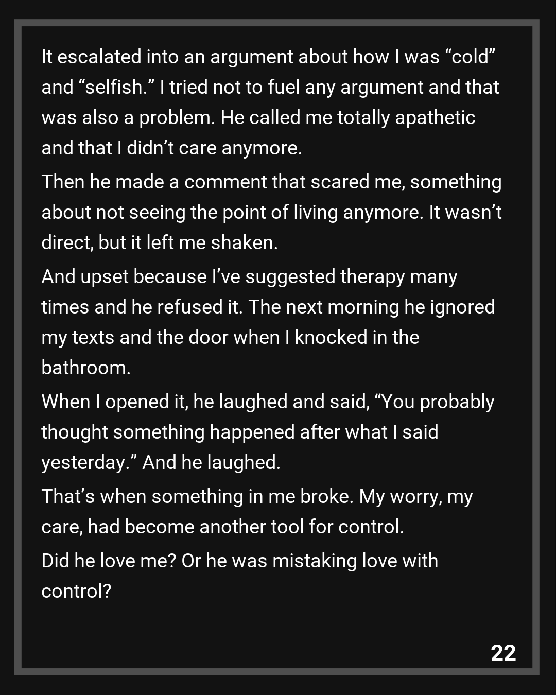 That’s when something in me broke. My worry, my care, had become another tool for control. Did he love me? Or he was mistaking love with control?