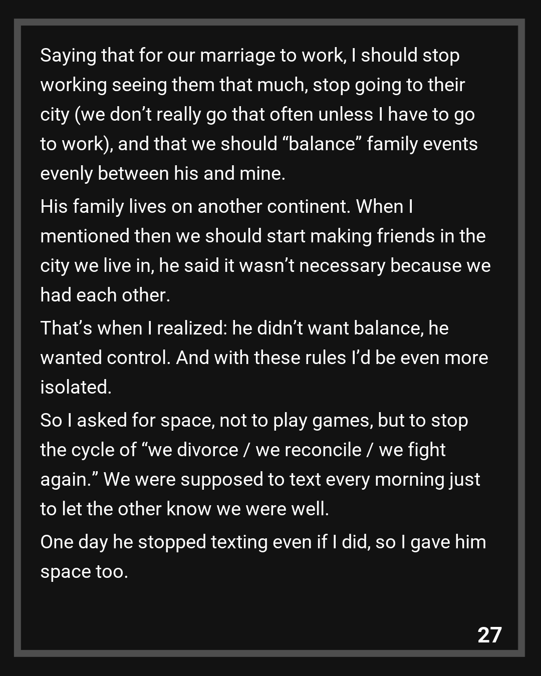 The following day he started blaming my parents now. Saying that for our marriage to work, I should stop working seeing them that much, stop going to their city (we don’t really go that often unless I have to go to work), and that we should “balance” family events evenly between his and mine. His family lives on another continent. When I mentioned then we should start making friends in the city we live in, he said it wasn’t necessary because we had each other. That’s when I realized: he didn’t want balance, he wanted control. And with these rules I’d be even more isolated.