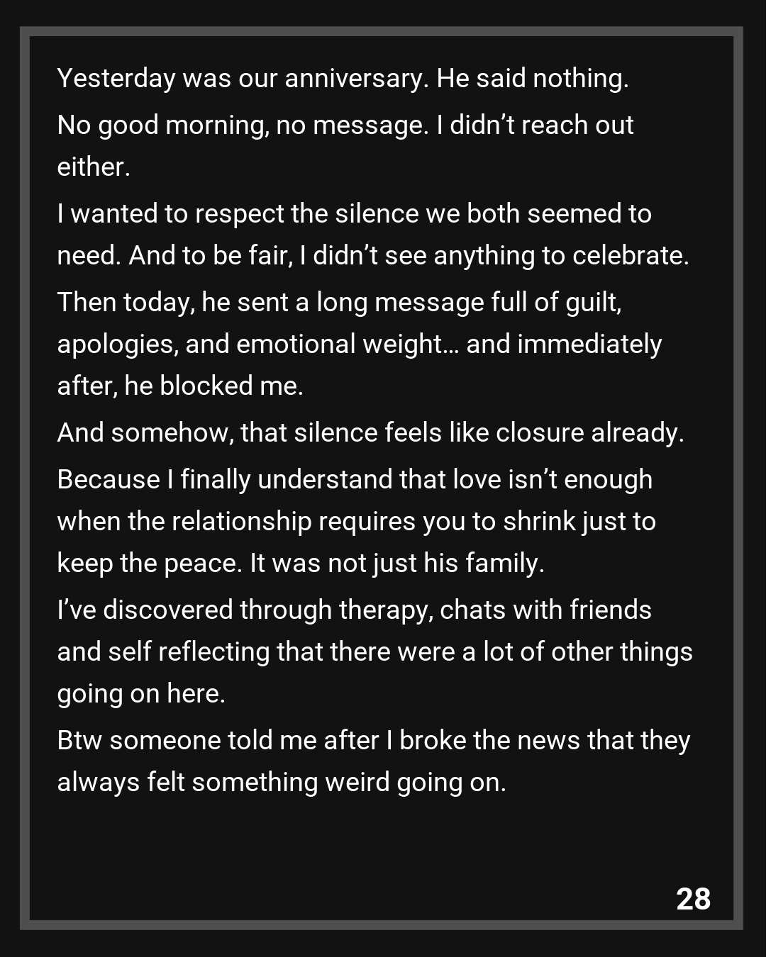 Yesterday was our anniversary. He said nothing. No good morning, no message. I didn’t reach out either. I wanted to respect the silence we both seemed to need. And to be fair, I didn’t see anything to celebrate.