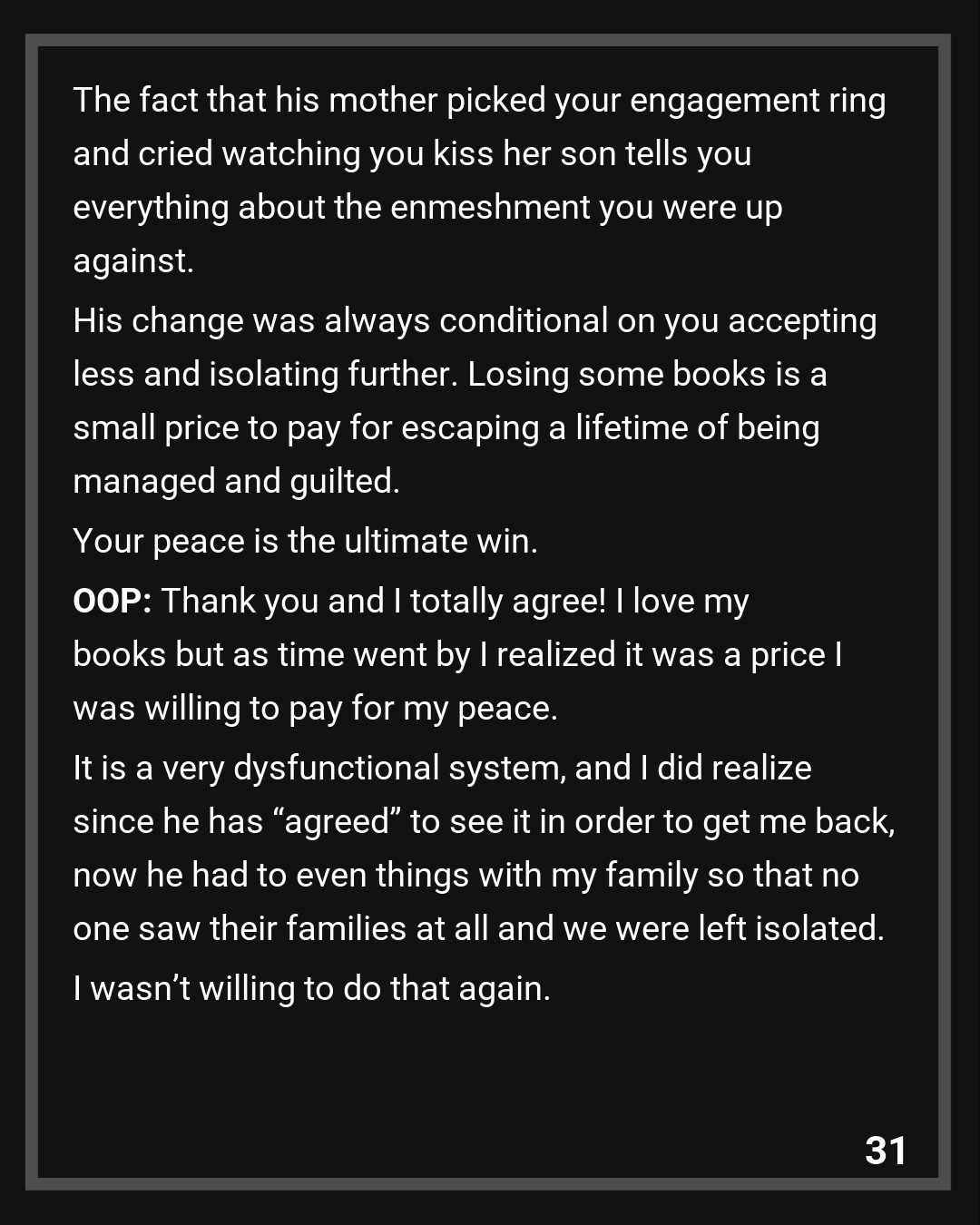 Commenter 3: You didn’t just leave a man, you left an entire dysfunctional system. The fact that his mother picked your engagement ring and cried watching you kiss her son tells you everything about the enmeshment you were up against. His change was always conditional on you accepting less and isolating further. Losing some books is a small price to pay for escaping a lifetime of being managed and guilted. Your peace is the ultimate win.