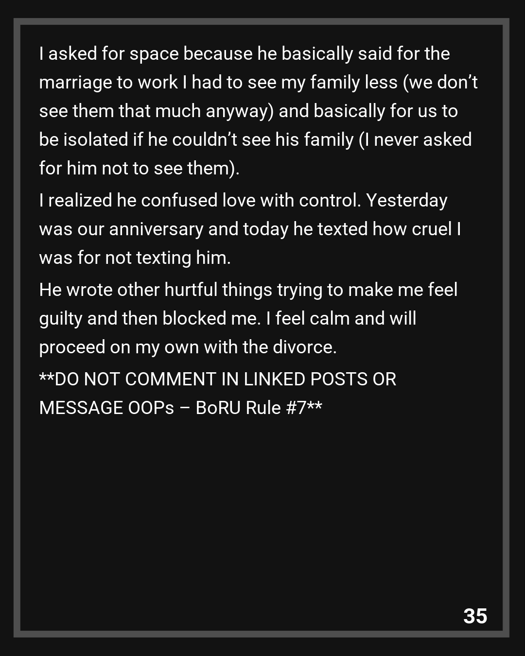 I realized he confused love with control. Yesterday was our anniversary and today he texted how cruel I was for not texting him. He wrote other hurtful things trying to make me feel guilty and then blocked me. I feel calm and will proceed on my own with the divorce.