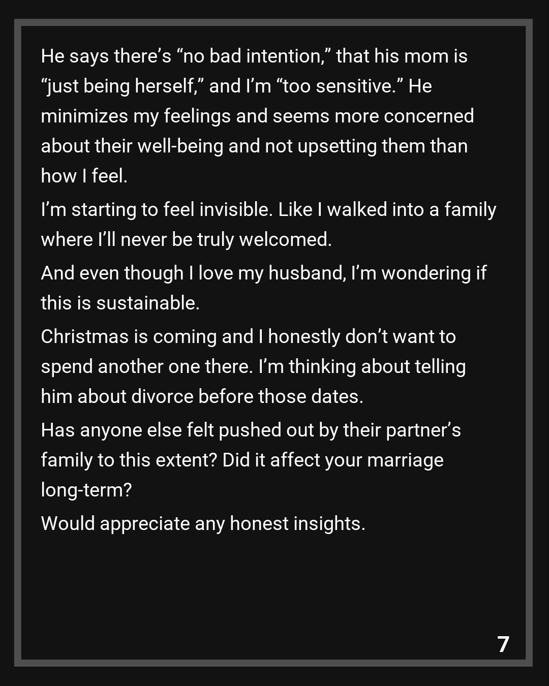 I’m starting to feel invisible. Like I walked into a family where I’ll never be truly welcomed. And even though I love my husband, I’m wondering if this is sustainable.