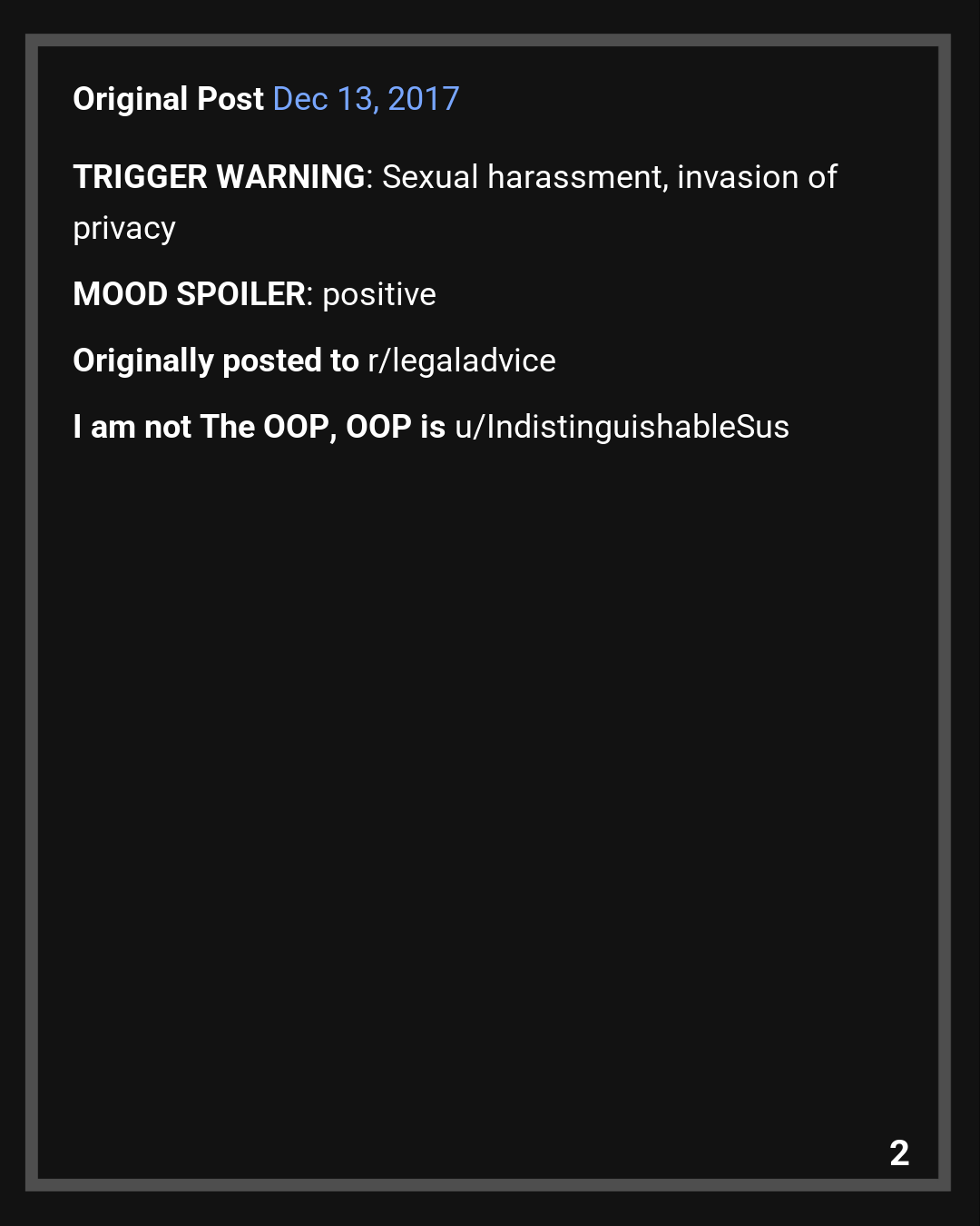 TRIGGER WARNING: Sexual harassment, invasion of privacy