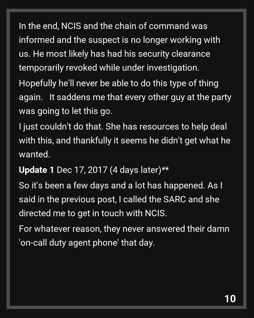 I left work and immediately drove to the NCIS office on base. The agent there was awesome. We went through all of the details and I started writing out my statement. While doing so, my officer in charge called me to get details so he could pass it up the chain. I told him that I was already at NCIS and he was pleased. He thanked me for coming forward and ensuring our co-worker would be protected. By the time I finished writing my statement, the whole command was aware of the situation. I was pleased.