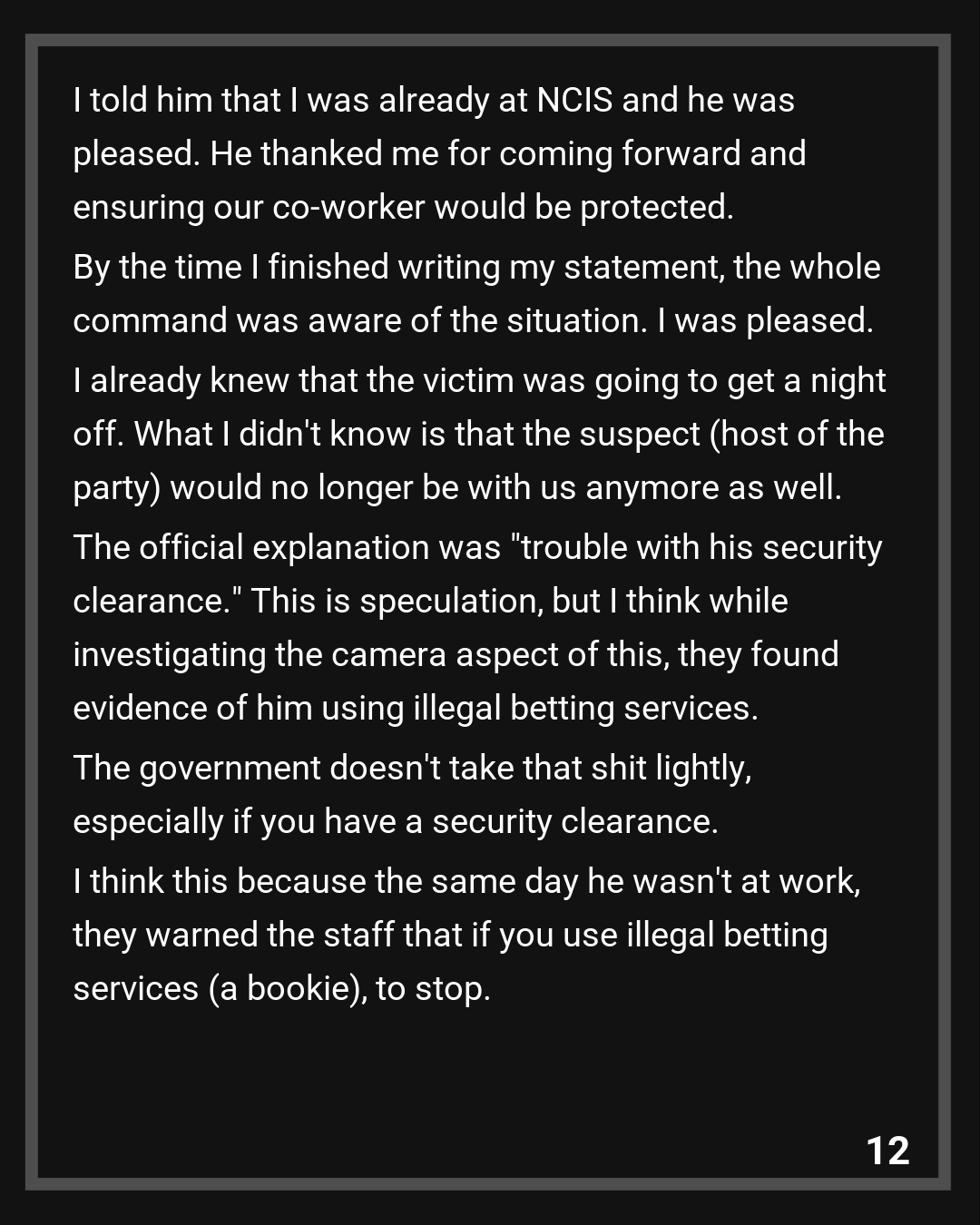 I already knew that the victim was going to get a night off. What I didn’t know is that the suspect (host of the party) would no longer be with us anymore as well. The official explanation was “trouble with his security clearance.” This is speculation, but I think while investigating the camera aspect of this, they found evidence of him using illegal betting services. The government doesn’t take that shit lightly, especially if you have a security clearance. I think this because the same day he wasn’t at work, they warned the staff that if you use illegal betting services (a bookie), to stop.