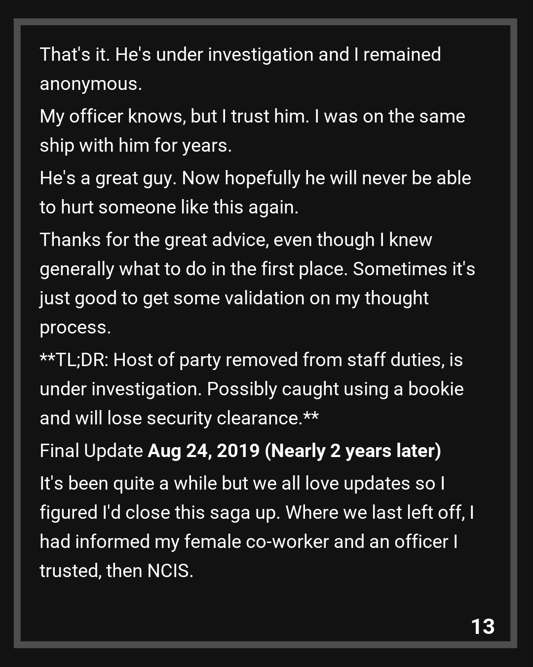 That’s it. He’s under investigation and I remained anonymous. My officer knows, but I trust him. I was on the same ship with him for years. He’s a great guy. Now hopefully he will never be able to hurt someone like this again. Thanks for the great advice, even though I knew generally what to do in the first place. Sometimes it’s just good to get some validation on my thought process.