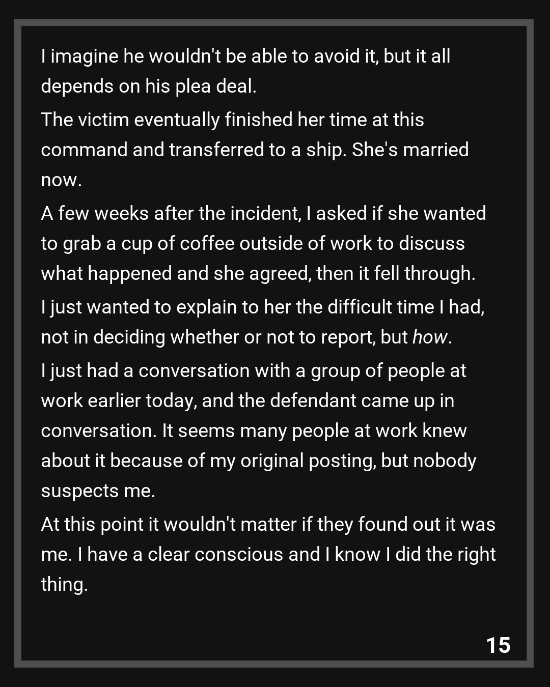 The victim eventually finished her time at this command and transferred to a ship. She’s married now. A few weeks after the incident, I asked if she wanted to grab a cup of coffee outside of work to discuss what happened and she agreed, then it fell through. I just wanted to explain to her the difficult time I had, not in deciding whether or not to report, but how.