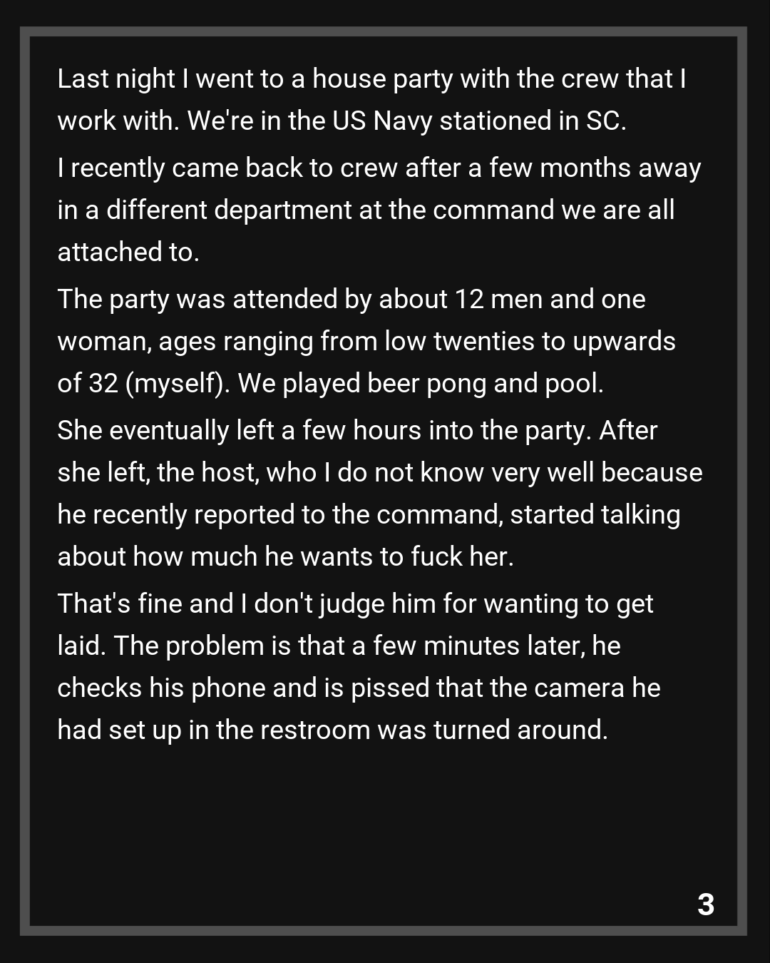 She eventually left a few hours into the party. After she left, the host, who I do not know very well because he recently reported to the command, started talking about how much he wants to fuck her. That’s fine and I don’t judge him for wanting to get laid. The problem is that a few minutes later, he checks his phone and is pissed that the camera he had set up in the restroom was turned around.