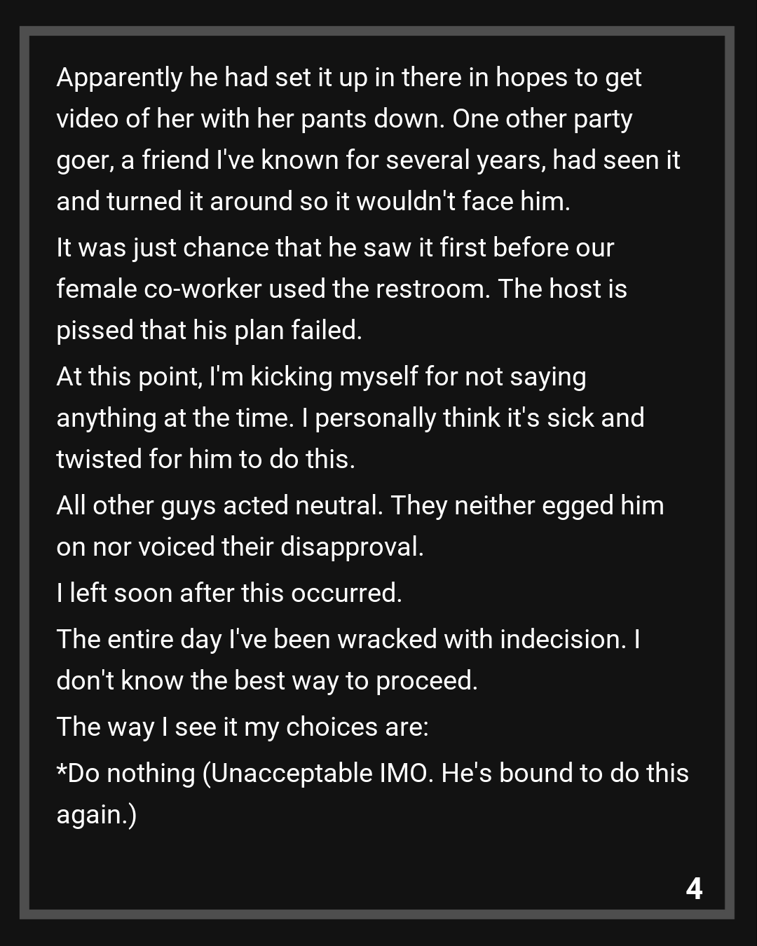 From there, the tension shifts inward. The narrator weighs his options within a tight professional ecosystem: remain silent and protect his own standing, warn the woman directly, escalate formally, or attempt anonymity. Workplace hierarchy complicates each route. Trust in leadership is uncertain. The social circle is small.