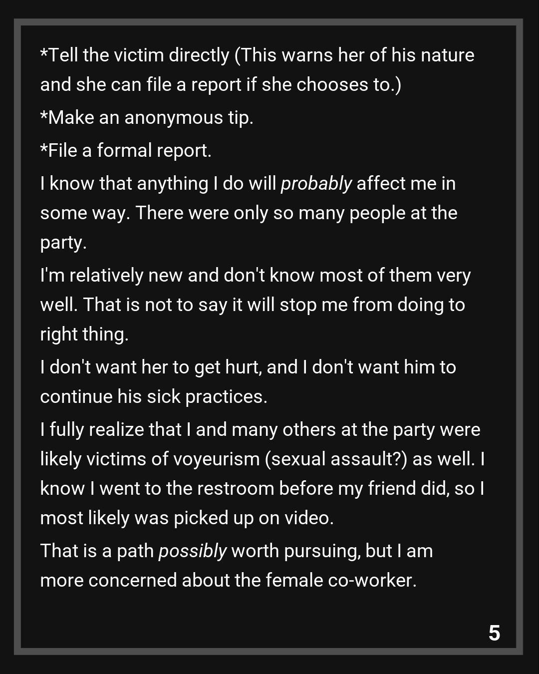 I know that anything I do will probably affect me in some way. There were only so many people at the party. I’m relatively new and don’t know most of them very well. That is not to say it will stop me from doing to right thing. I don’t want her to get hurt, and I don’t want him to continue his sick practices.