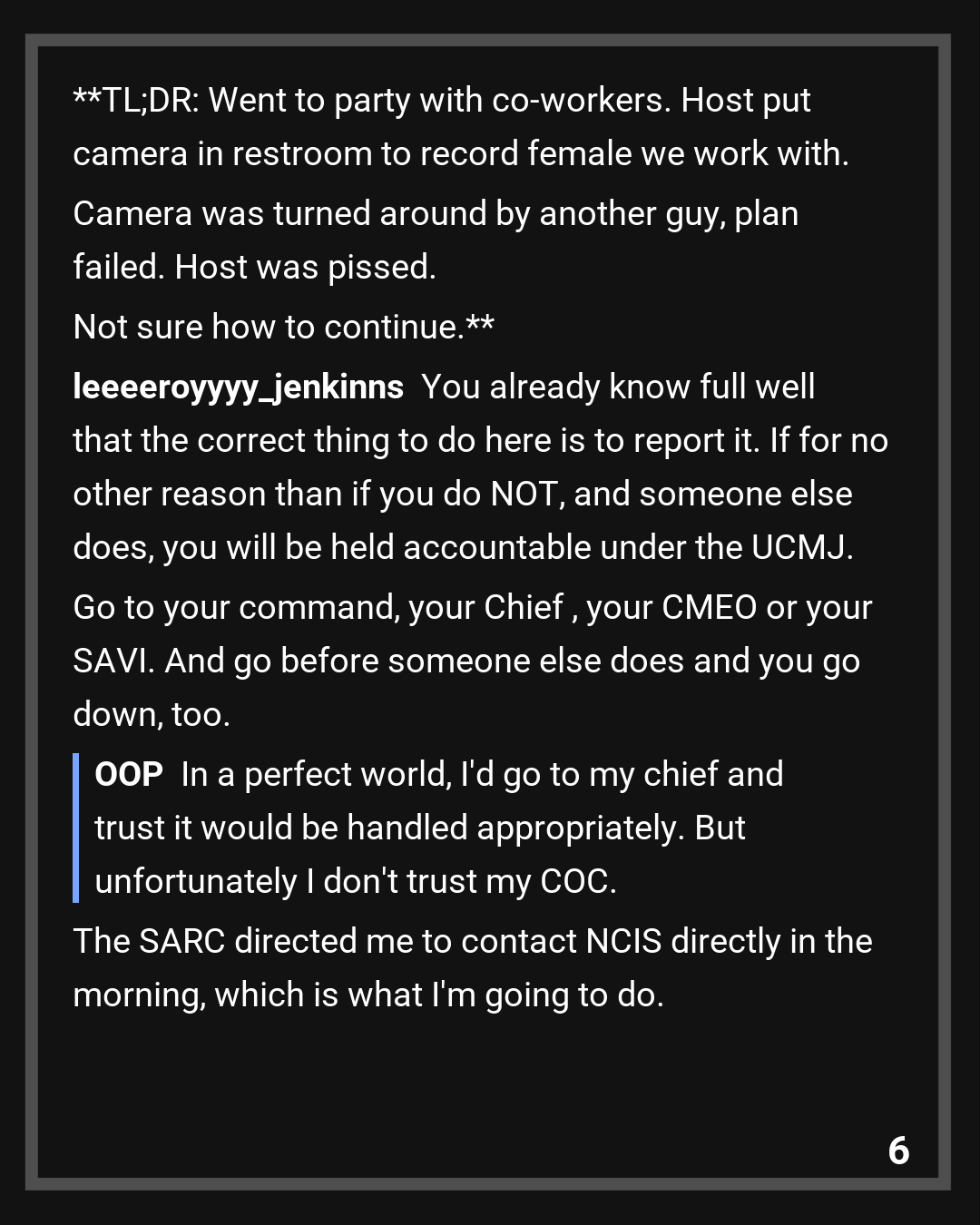 In a perfect world, I’d go to my chief and trust it would be handled appropriately. But unfortunately I don’t trust my COC. The SARC directed me to contact NCIS directly in the morning, which is what I’m going to do.