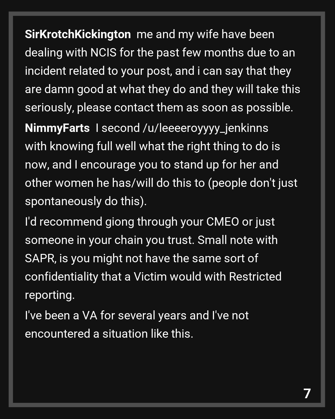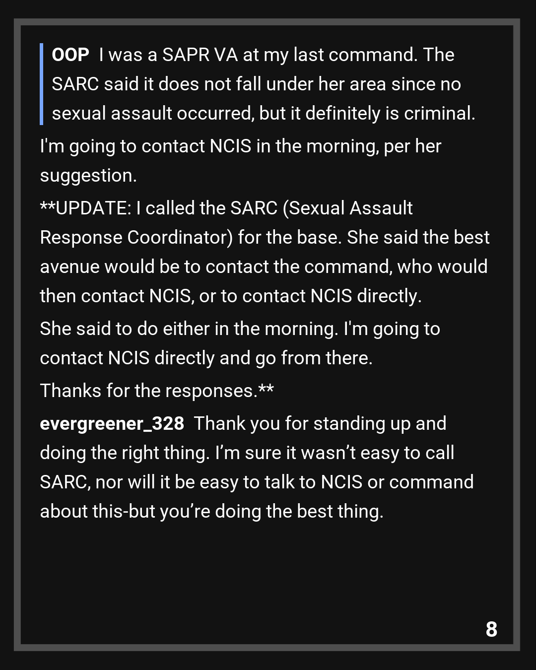 Thank you for standing up and doing the right thing. I’m sure it wasn’t easy to call SARC, nor will it be easy to talk to NCIS or command about this-but you’re doing the best thing. The rates of sexual assault for women serving in the military is devastatingly high-working at the VA, all of my female veterans had histories of sexual assault while serving and were attacked by other service members or higher ups. This post gives me a lot of hope that things are changing and I hope more service members are like you. Thank you for serving and thank you for doing this. It really really does mean a lot!!