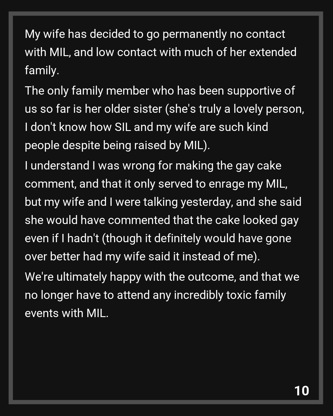 My wife has decided to go permanently no contact with MIL, and low contact with much of her extended family. The only family member who has been supportive of us so far is her older sister (she’s truly a lovely person, I don’t know how SIL and my wife are such kind people despite being raised by MIL).