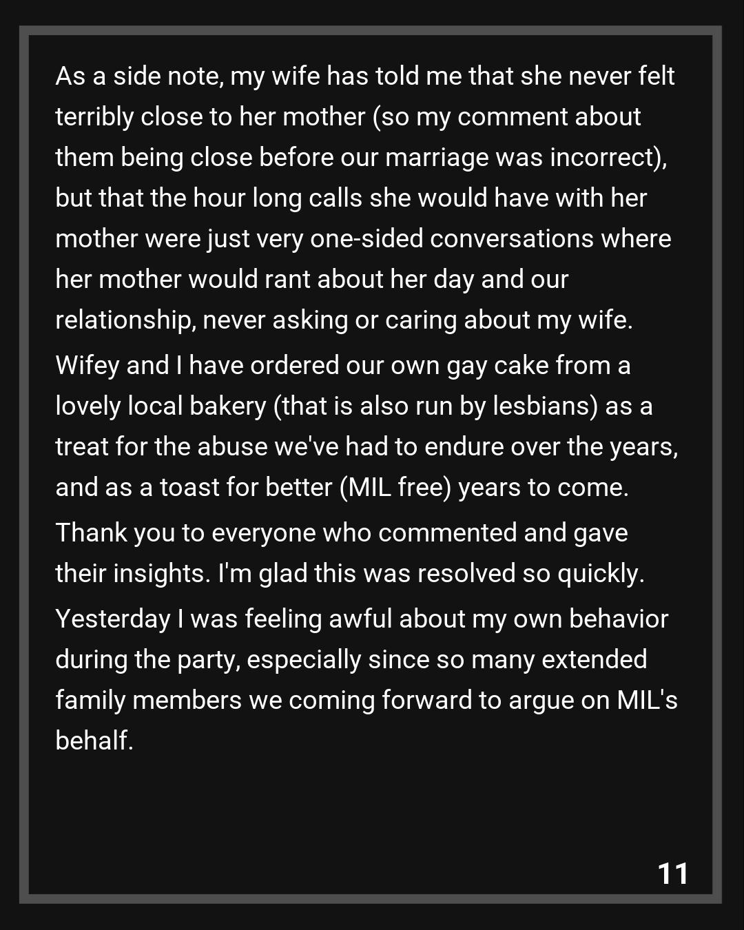 I understand I was wrong for making the gay cake comment, and that it only served to enrage my MIL, but my wife and I were talking yesterday, and she said she would have commented that the cake looked gay even if I hadn’t (though it definitely would have gone over better had my wife said it instead of me). We’re ultimately happy with the outcome, and that we no longer have to attend any incredibly toxic family events with MIL. As a side note, my wife has told me that she never felt terribly close to her mother (so my comment about them being close before our marriage was incorrect), but that the hour long calls she would have with her mother were just very one-sided conversations where her mother would rant about her day and our relationship, never asking or caring about my wife.