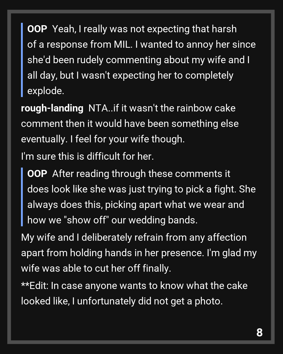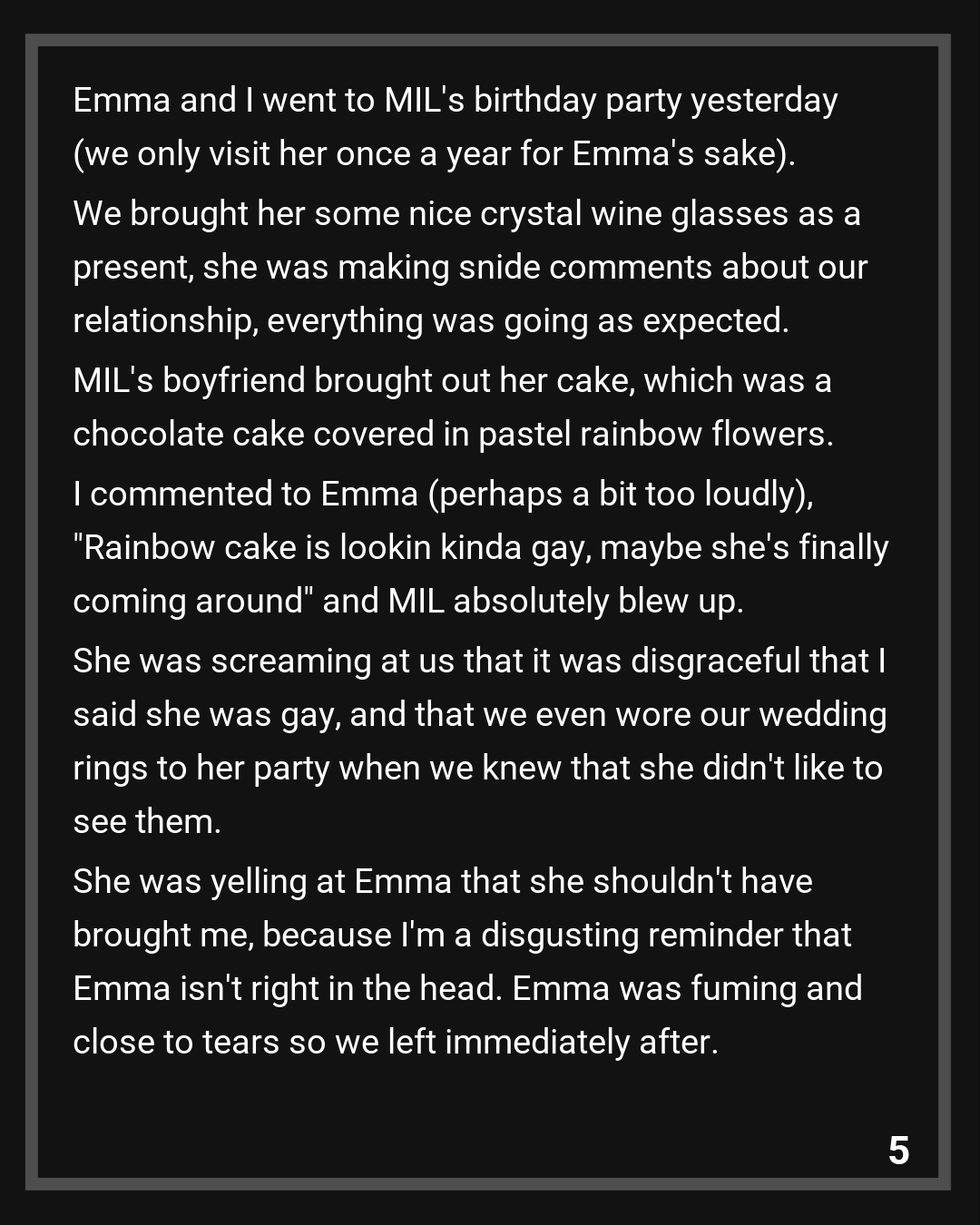 Emma and I went to MIL’s birthday party yesterday (we only visit her once a year for Emma’s sake). We brought her some nice crystal wine glasses as a present, she was making snide comments about our relationship, everything was going as expected. MIL’s boyfriend brought out her cake, which was a chocolate cake covered in pastel rainbow flowers. I commented to Emma (perhaps a bit too loudly), “Rainbow cake is lookin kinda gay, maybe she’s finally coming around” and MIL absolutely blew up. She was screaming at us that it was disgraceful that I said she was gay, and that we even wore our wedding rings to her party when we knew that she didn’t like to see them. She was yelling at Emma that she shouldn’t have brought me, because I’m a disgusting reminder that Emma isn’t right in the head. Emma was fuming and close to tears so we left immediately after.