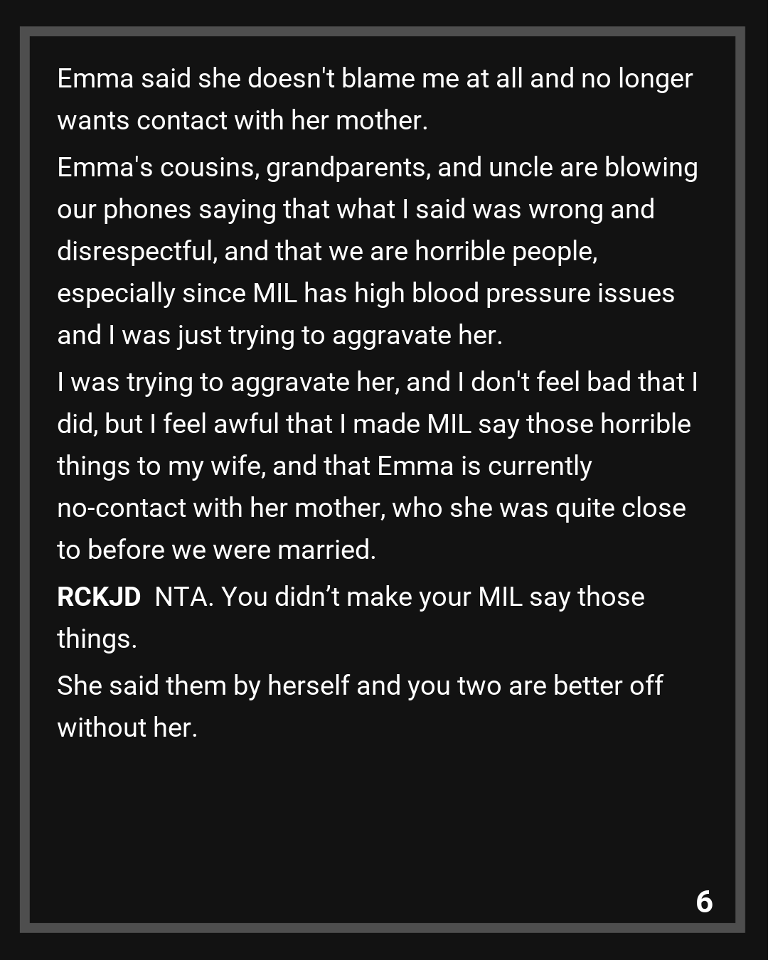Emma said she doesn’t blame me at all and no longer wants contact with her mother. Emma’s cousins, grandparents, and uncle are blowing our phones saying that what I said was wrong and disrespectful, and that we are horrible people, especially since MIL has high blood pressure issues and I was just trying to aggravate her. I was trying to aggravate her, and I don’t feel bad that I did, but I feel awful that I made MIL say those horrible things to my wife, and that Emma is currently no-contact with her mother, who she was quite close to before we were married.