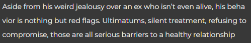 Thank you so much for this. I was genuinely beginning to feel like there was something I wasn’t getting and I’m so tired of explaining the same thing over and over again. I’ve told him the exact thing that I’m not comparing them or making him compete with a dead man and I don’t know how else to explain this to him.