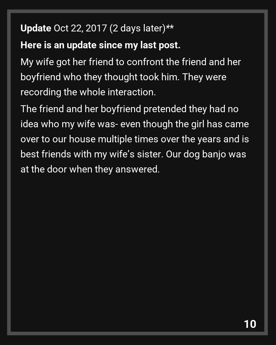My wife got her friend to confront the friend and her boyfriend who they thought took him. They were recording the whole interaction. The friend and her boyfriend pretended they had no idea who my wife was- even though the girl has came over to our house multiple times over the years and is best friends with my wife’s sister. Our dog banjo was at the door when they answered.
