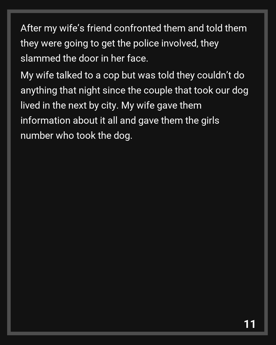 My wife talked to a cop but was told they couldn’t do anything that night since the couple that took our dog lived in the next by city. My wife gave them information about it all and gave them the girls number who took the dog. The cop called her and left a voicemail after she didn’t answer.