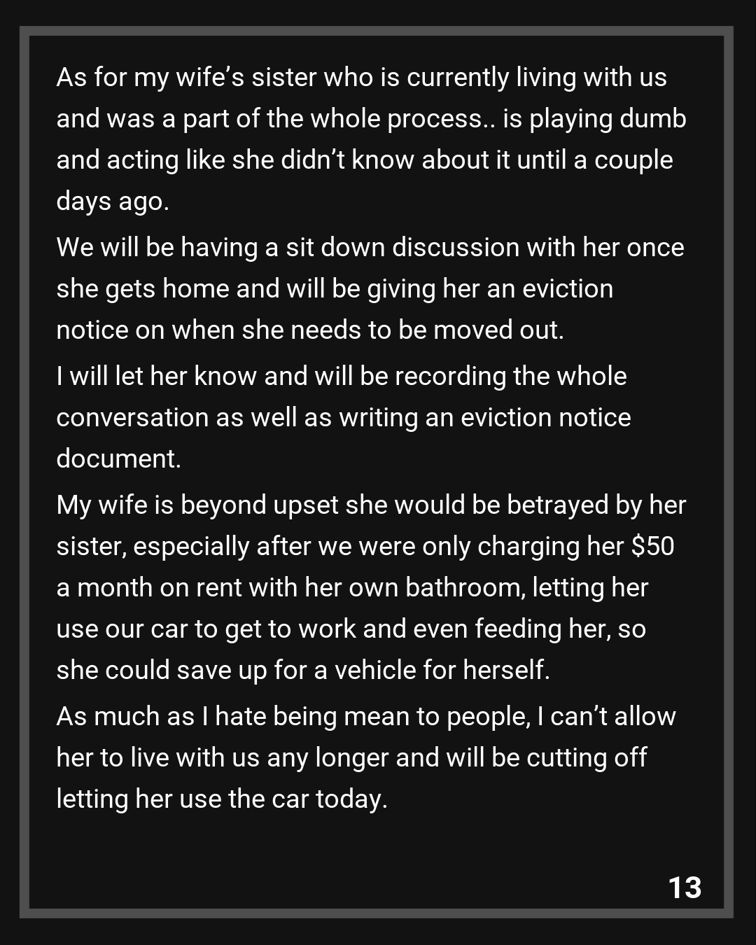 My wife is beyond upset she would be betrayed by her sister, especially after we were only charging her $50 a month on rent with her own bathroom, letting her use our car to get to work and even feeding her, so she could save up for a vehicle for herself. As much as I hate being mean to people, I can’t allow her to live with us any longer and will be cutting off letting her use the car today.