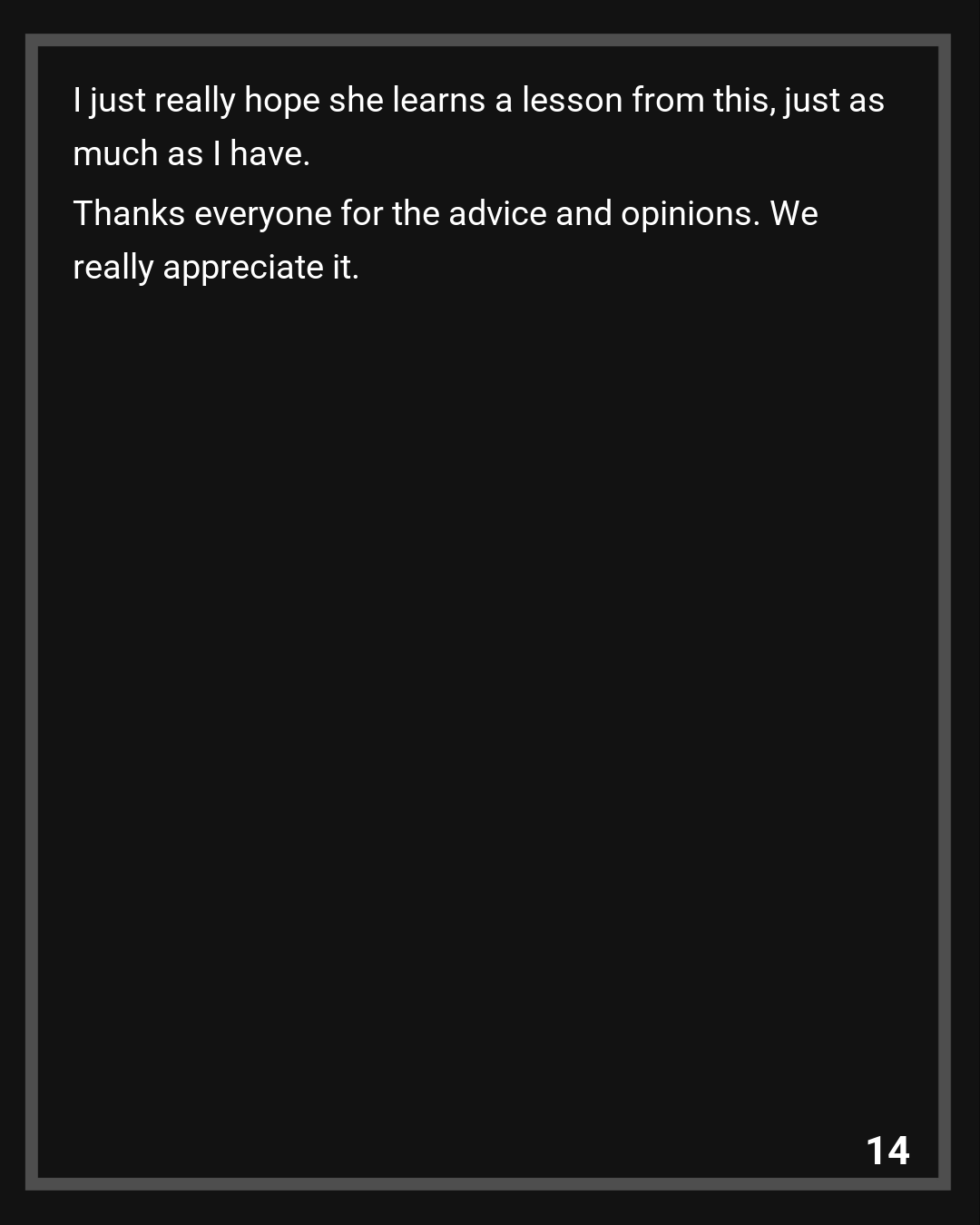 I just really hope she learns a lesson from this, just as much as I have.