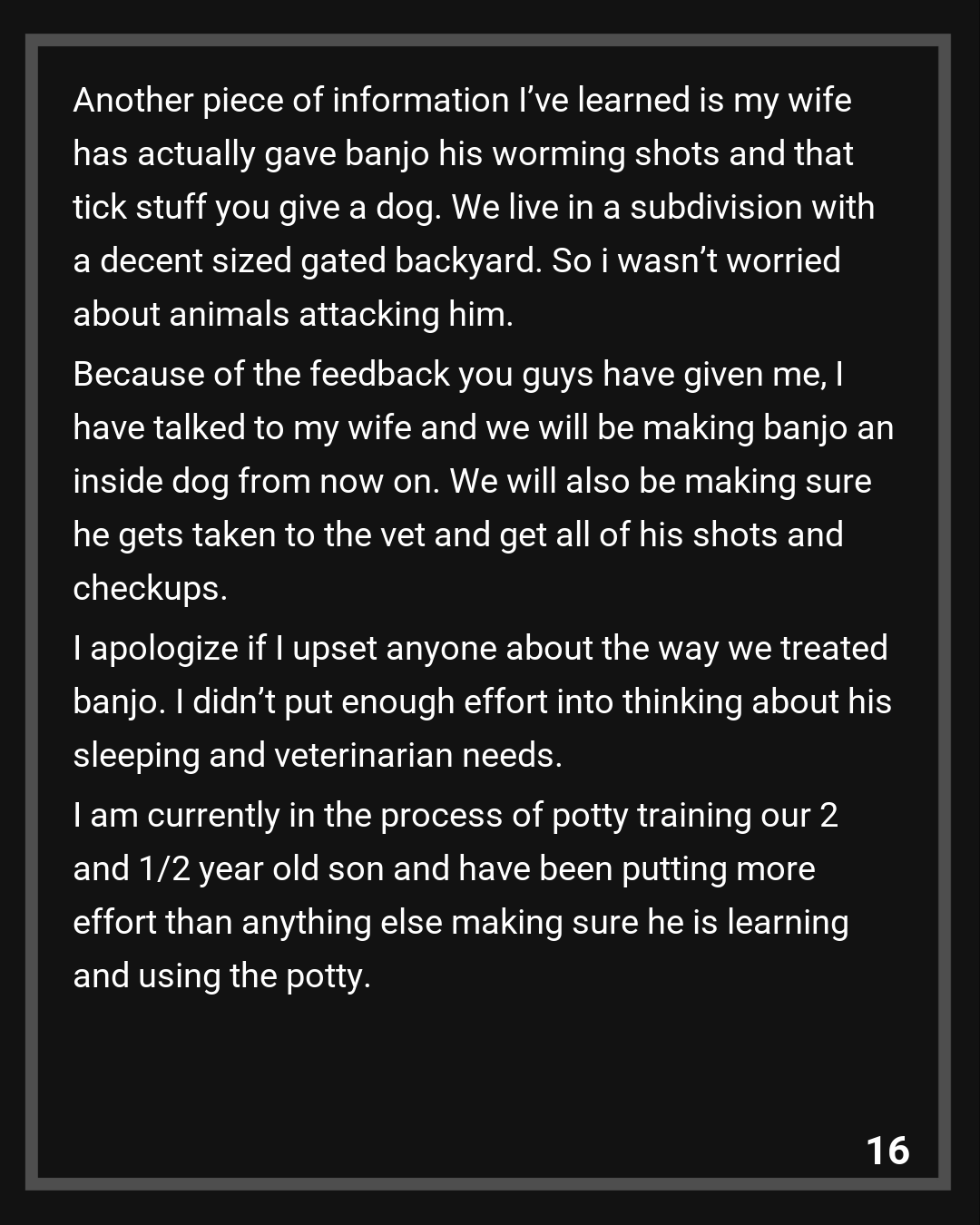 I apologize if I upset anyone about the way we treated banjo. I didn’t put enough effort into thinking about his sleeping and veterinarian needs. I am currently in the process of potty training our 2 and 1/2 year old son and have been putting more effort than anything else making sure he is learning and using the potty.
