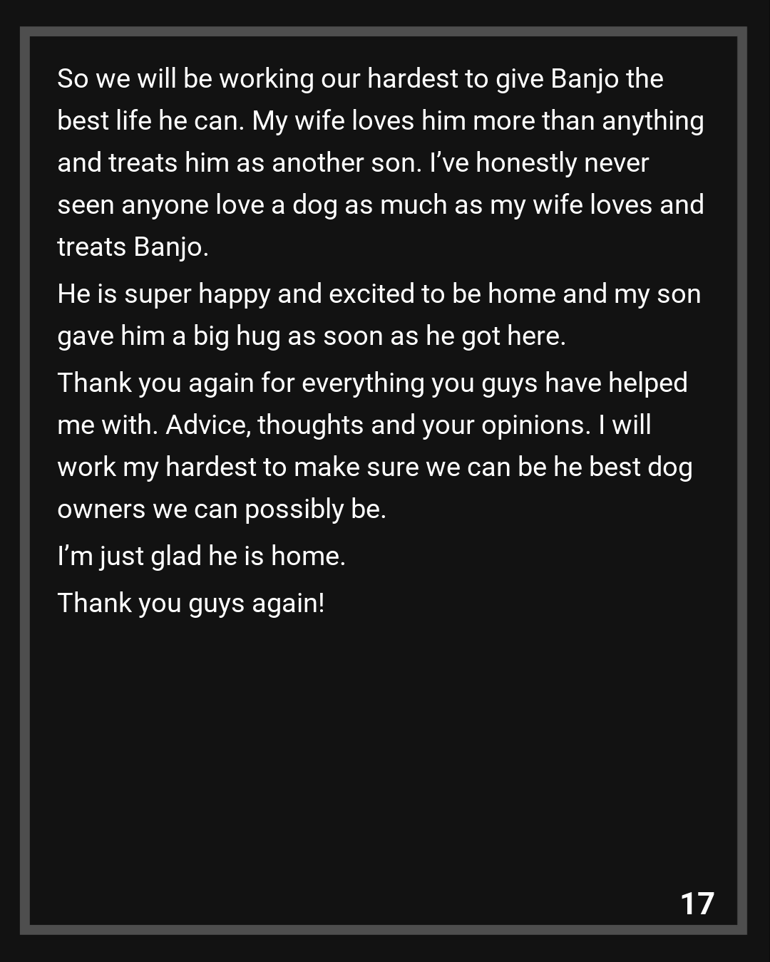 Thank you again for everything you guys have helped me with. Advice, thoughts and your opinions. I will work my hardest to make sure we can be he best dog owners we can possibly be. I’m just glad he is home.
