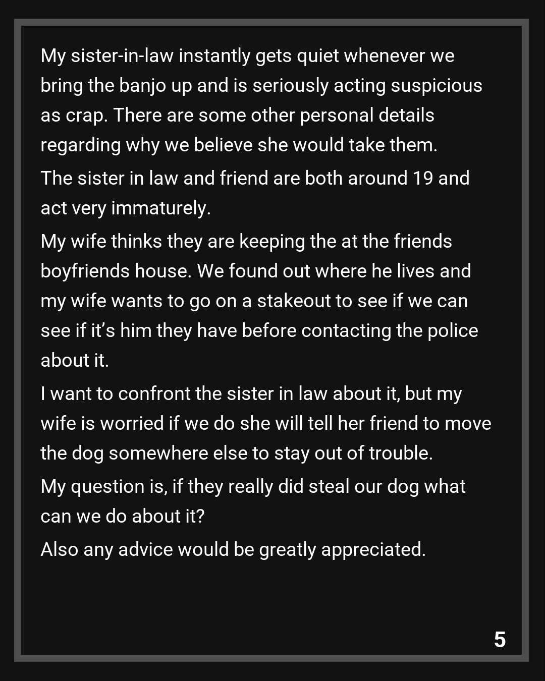 90% positive my sister-in-law (currently living with us) stole my wife’s dog and gave him to her friend