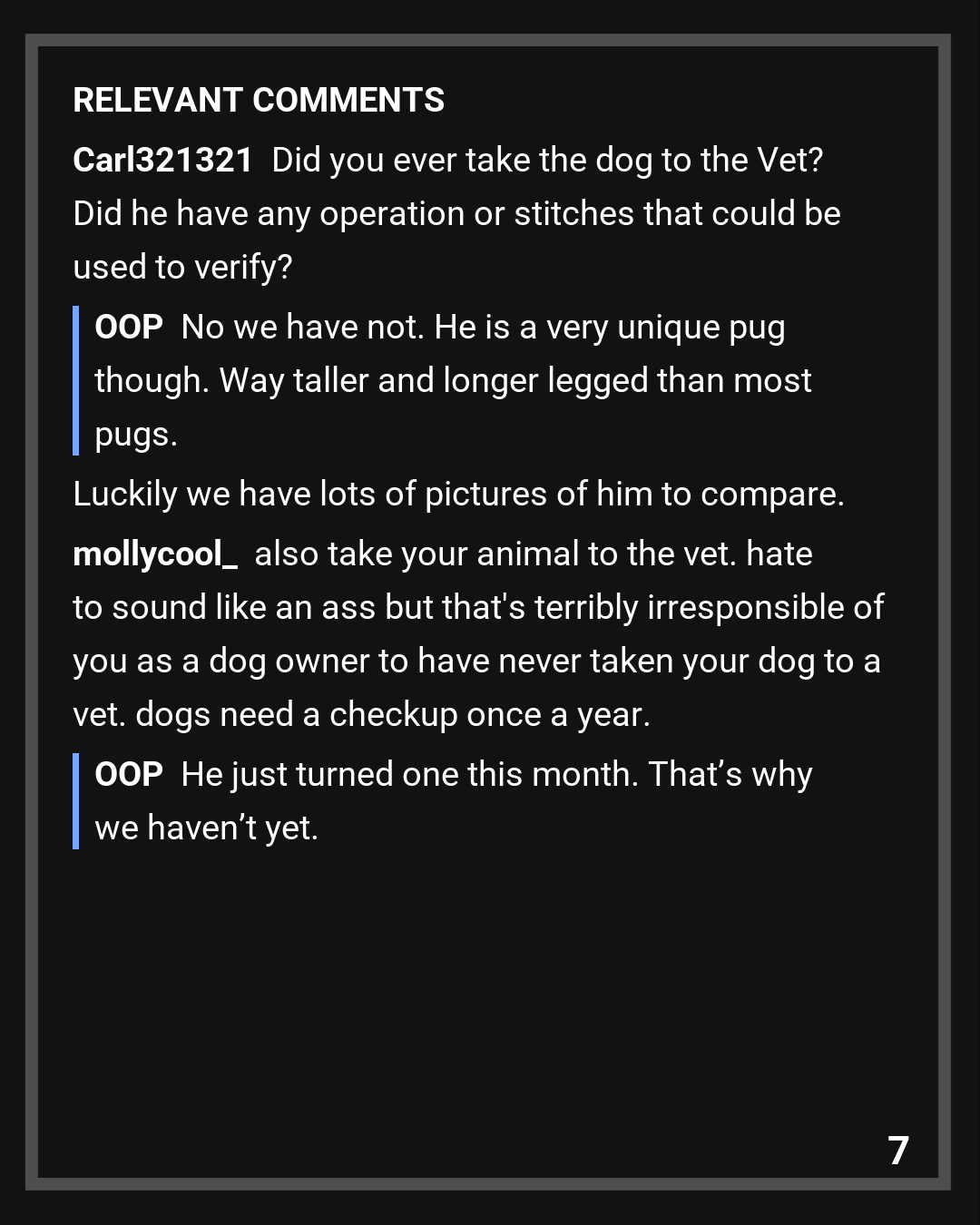 Apparently my wife’s sister’s friend posted to social media with a picture of a brand new pug she got- which happened to be the night before he went missing. When my wife went to look the friend and sister in law blocked her from their social media. We had someone else try and look to see if it was him, but the post was quickly removed I guess.