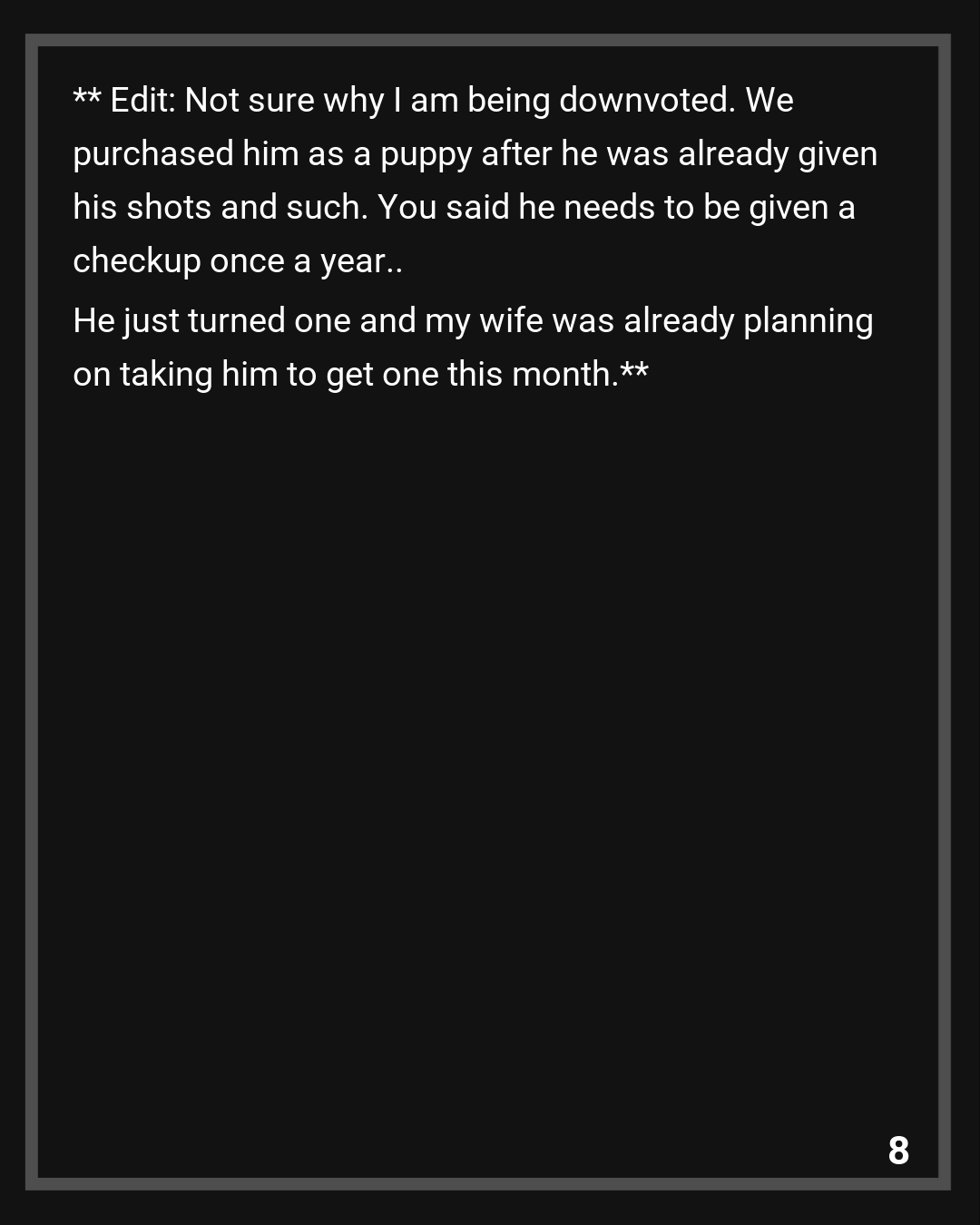 Edit: Not sure why I am being downvoted. We purchased him as a puppy after he was already given his shots and such. You said he needs to be given a checkup once a year.. He just turned one and my wife was already planning on taking him to get one this month.