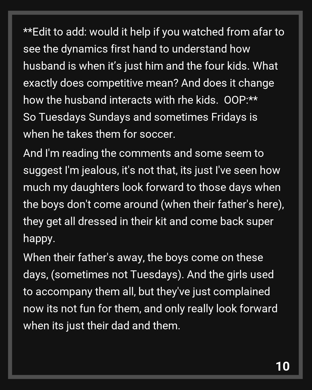 Edit to add: would it help if you watched from afar to see the dynamics first hand to understand how husband is when it’s just him and the four kids. What exactly does competitive mean? And does it change how the husband interacts with rhe kids.