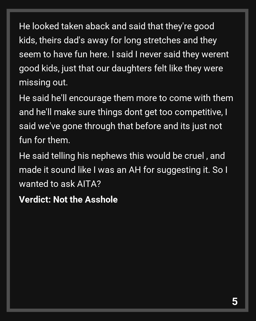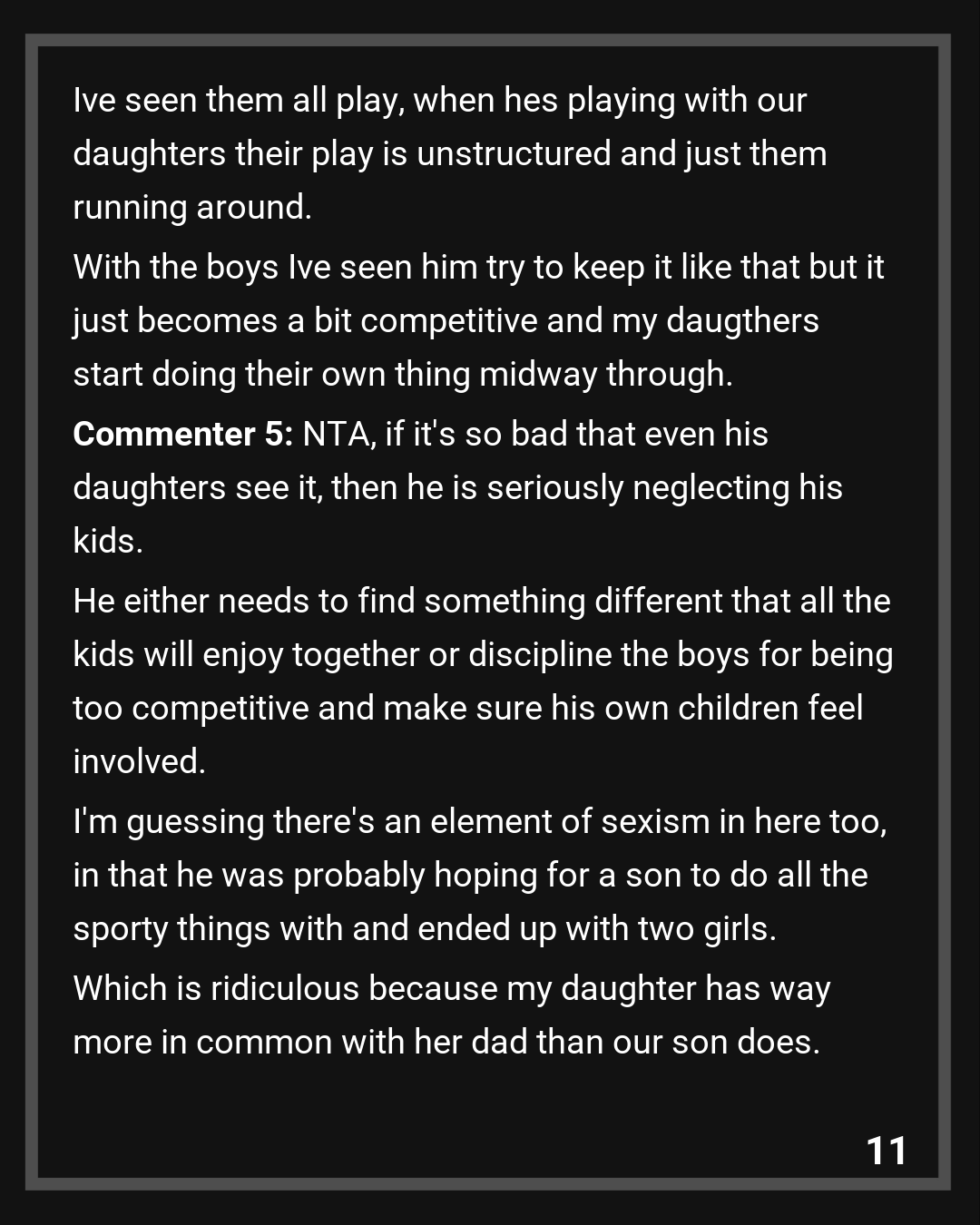 Commenter 5: NTA, if it’s so bad that even his daughters see it, then he is seriously neglecting his kids. He either needs to find something different that all the kids will enjoy together or discipline the boys for being too competitive and make sure his own children feel involved.