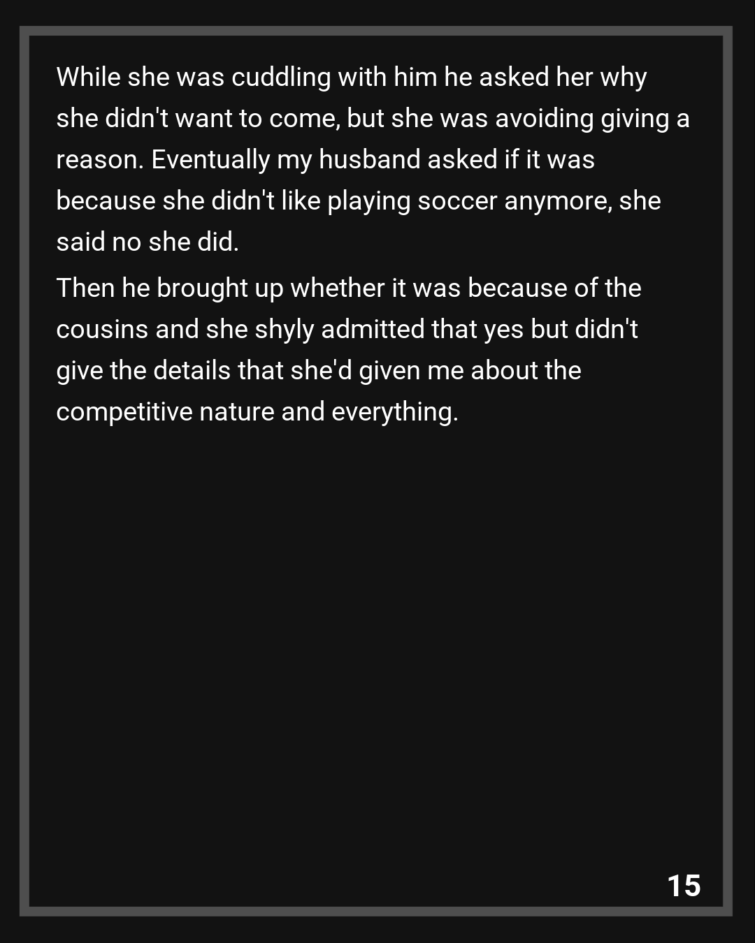 While she was cuddling with him he asked her why she didn’t want to come, but she was avoiding giving a reason. Eventually my husband asked if it was because she didn’t like playing soccer anymore, she said no she did. Then he brought up whether it was because of the cousins and she shyly admitted that yes but didn’t give the details that she’d given me about the competitive nature and everything.