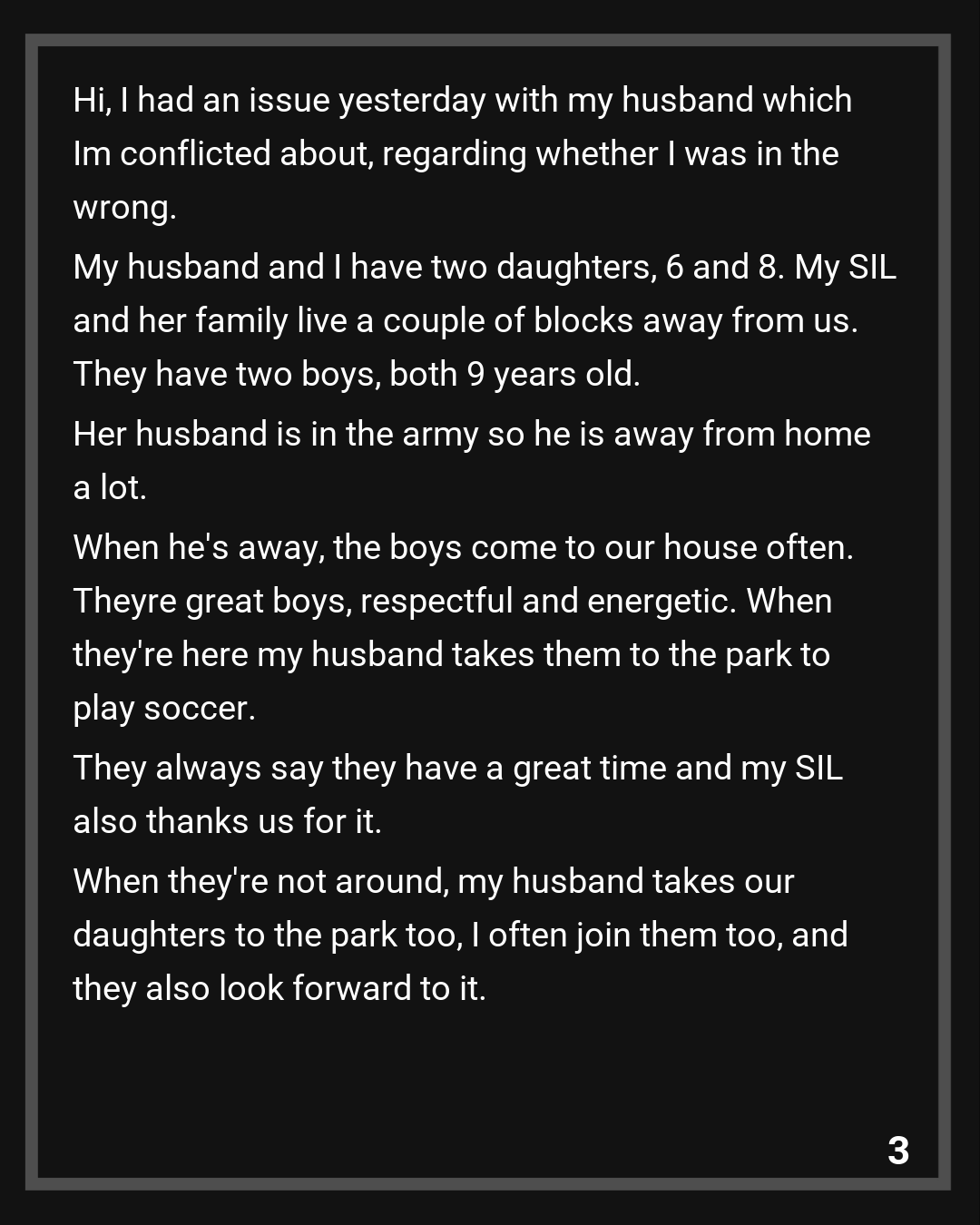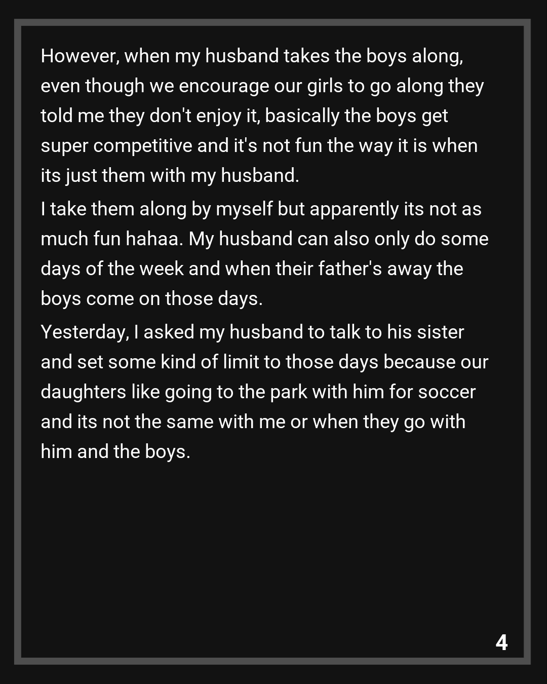 Yesterday, I asked my husband to talk to his sister and set some kind of limit to those days because our daughters like going to the park with him for soccer and its not the same with me or when they go with him and the boys. He looked taken aback and said that they’re good kids, theirs dad’s away for long stretches and they seem to have fun here. I said I never said they werent good kids, just that our daughters felt like they were missing out. He said he’ll encourage them more to come with them and he’ll make sure things dont get too competitive, I said we’ve gone through that before and its just not fun for them. He said telling his nephews this would be cruel , and made it sound like I was an AH for suggesting it. So I wanted to ask AITA?