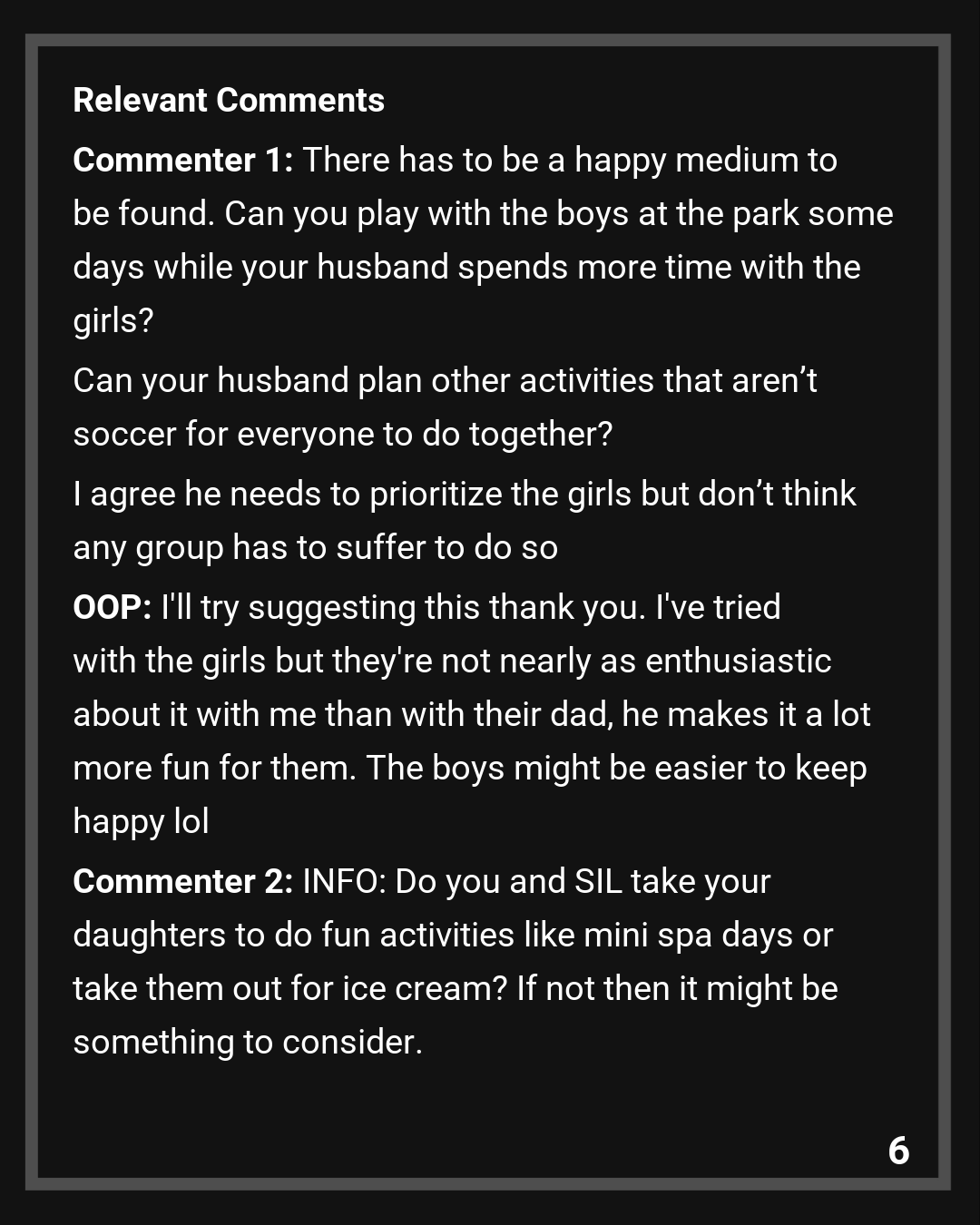 Commenter 1: There has to be a happy medium to be found. Can you play with the boys at the park some days while your husband spends more time with the girls?