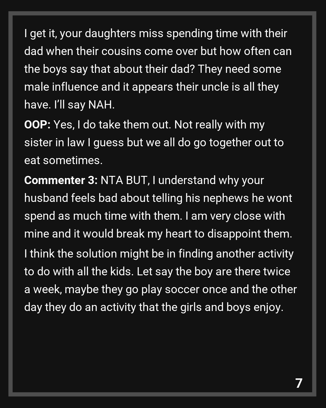 Commenter 3: NTA BUT, I understand why your husband feels bad about telling his nephews he wont spend as much time with them. I am very close with mine and it would break my heart to disappoint them. I think the solution might be in finding another activity to do with all the kids. Let say the boy are there twice a week, maybe they go play soccer once and the other day they do an activity that the girls and boys enjoy. Or a day he goes with the boys and the next one you do something with the boys and he goes with the girls. Unless you are not close with them or doesnt really have bond? I think splitting up the time between both parents so you both spend time with your nephews and your daugther might be a good solution.